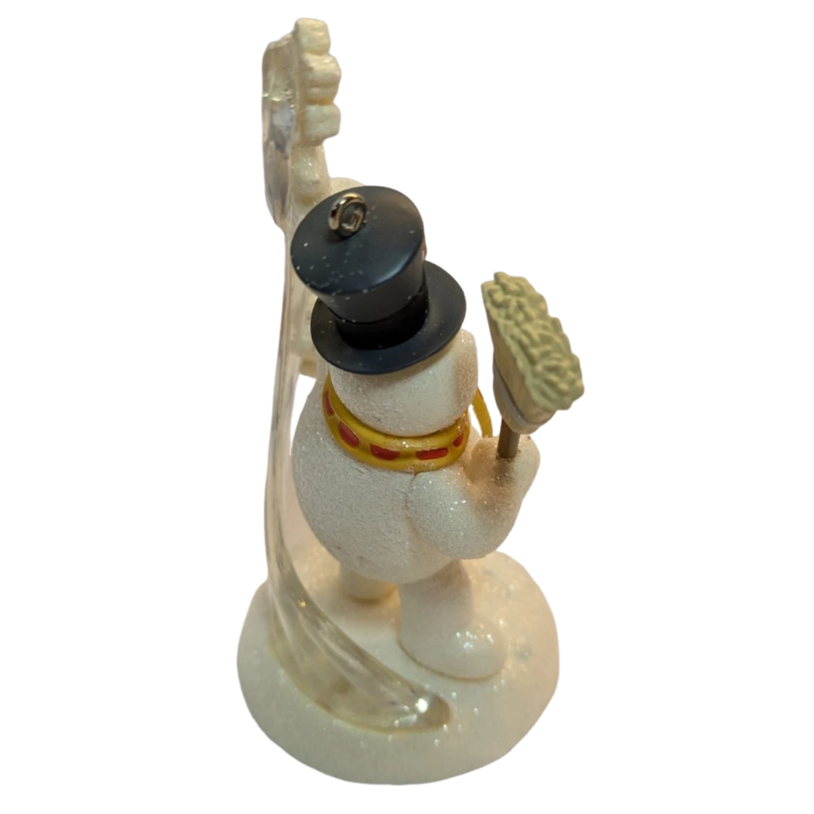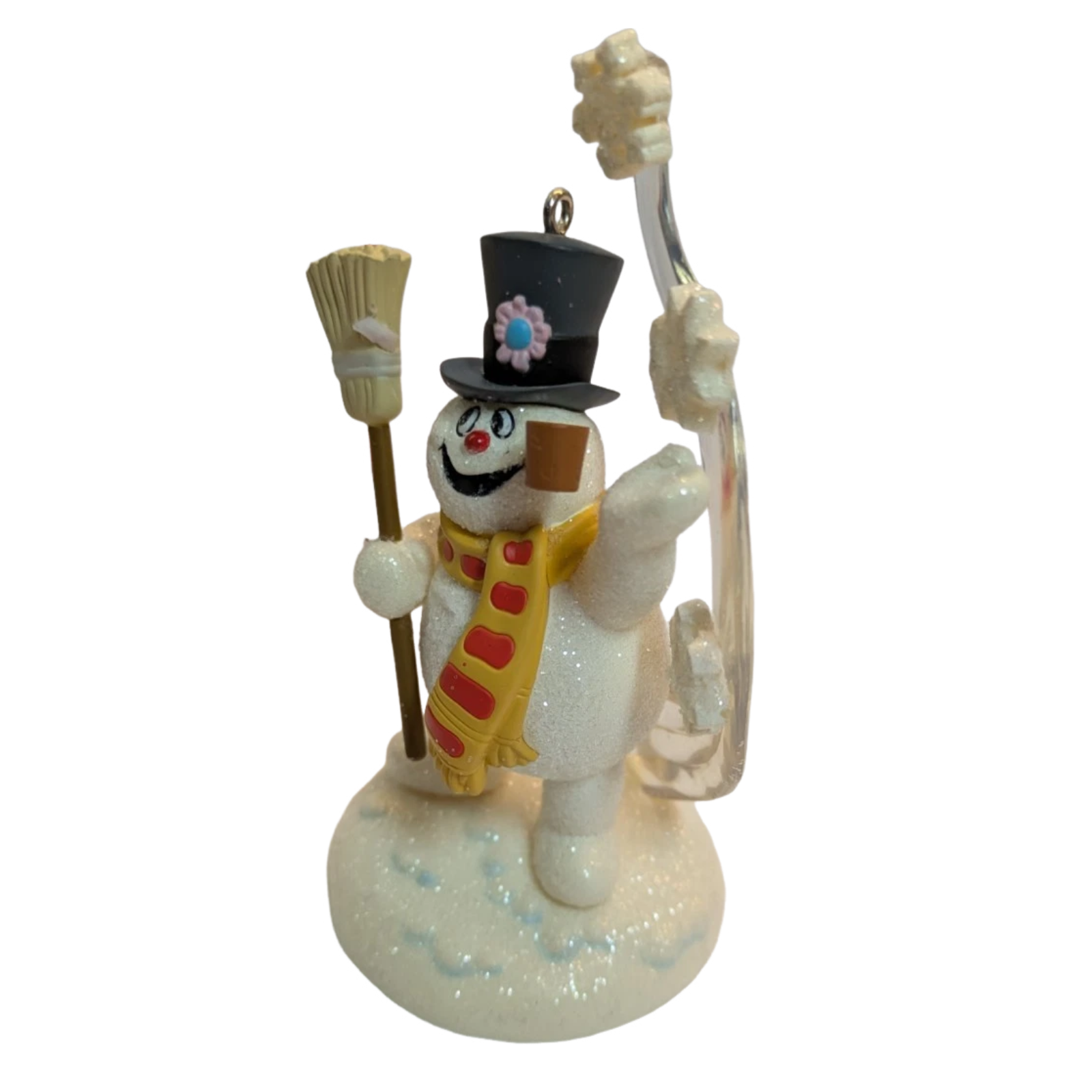 This collectible ornament showcases the beloved character Frosty the Snowman in his magic top hat, holding a broom as he whirls a swirl of snow around him—capturing the playful wonder and holiday magic of the classic animated Christmas story. (Official description: “Frosty the Snowman has on his magic top hat and a pipe in his mouth as he holds a broom and whirls the snow into the air.”) The sculpt is rendered in multicolour painted finish and sized for a tree-hanging format, making it a festive piece for both fans of the character and Hallmark ornament collectors.