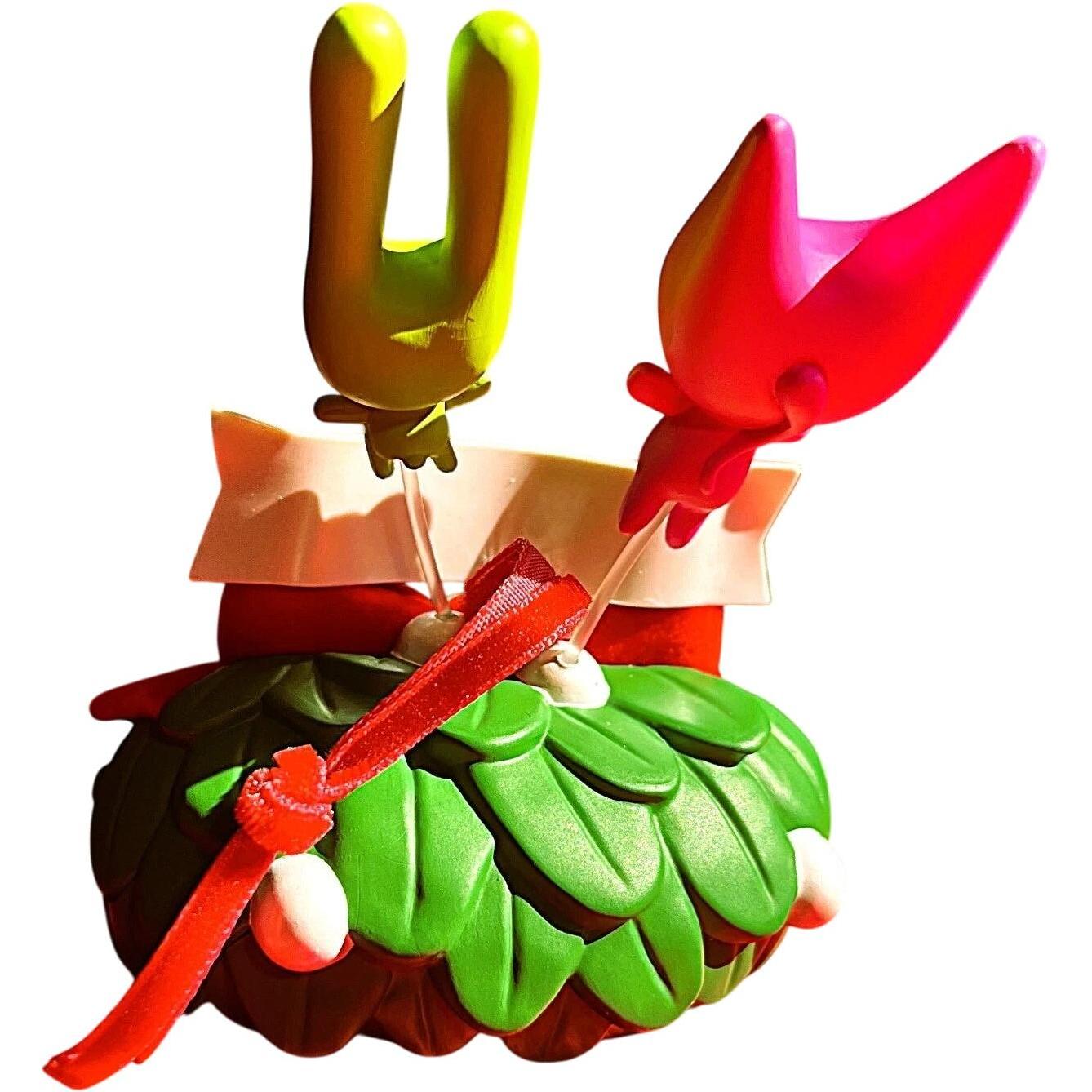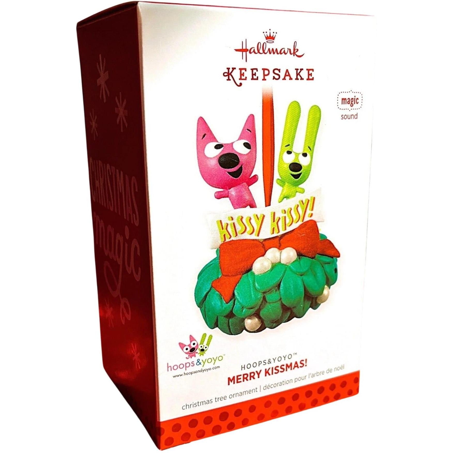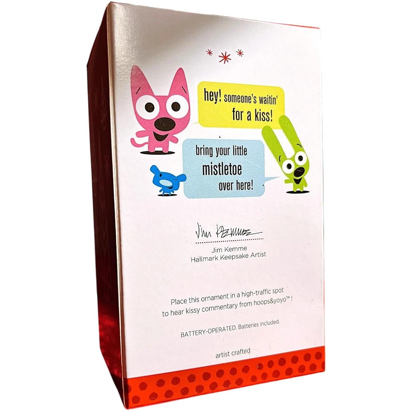 Bring a festive chuckle to your holiday décor with this playful 2013 Keepsake ornament featuring the beloved Hoops & Yoyo duo—Hoops (the energetic pink cat) and Yoyo (the lively green rabbit)—perched under a ring of mistletoe. A cheerful push of the button activates a treasure trove of six funny sayings to spread some Yuletide laughter. This ornament arrives mint-in-box complete with its original hang tag. It requires three LR44 batteries (included) to power the sound feature.