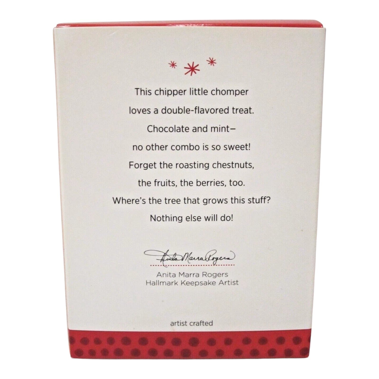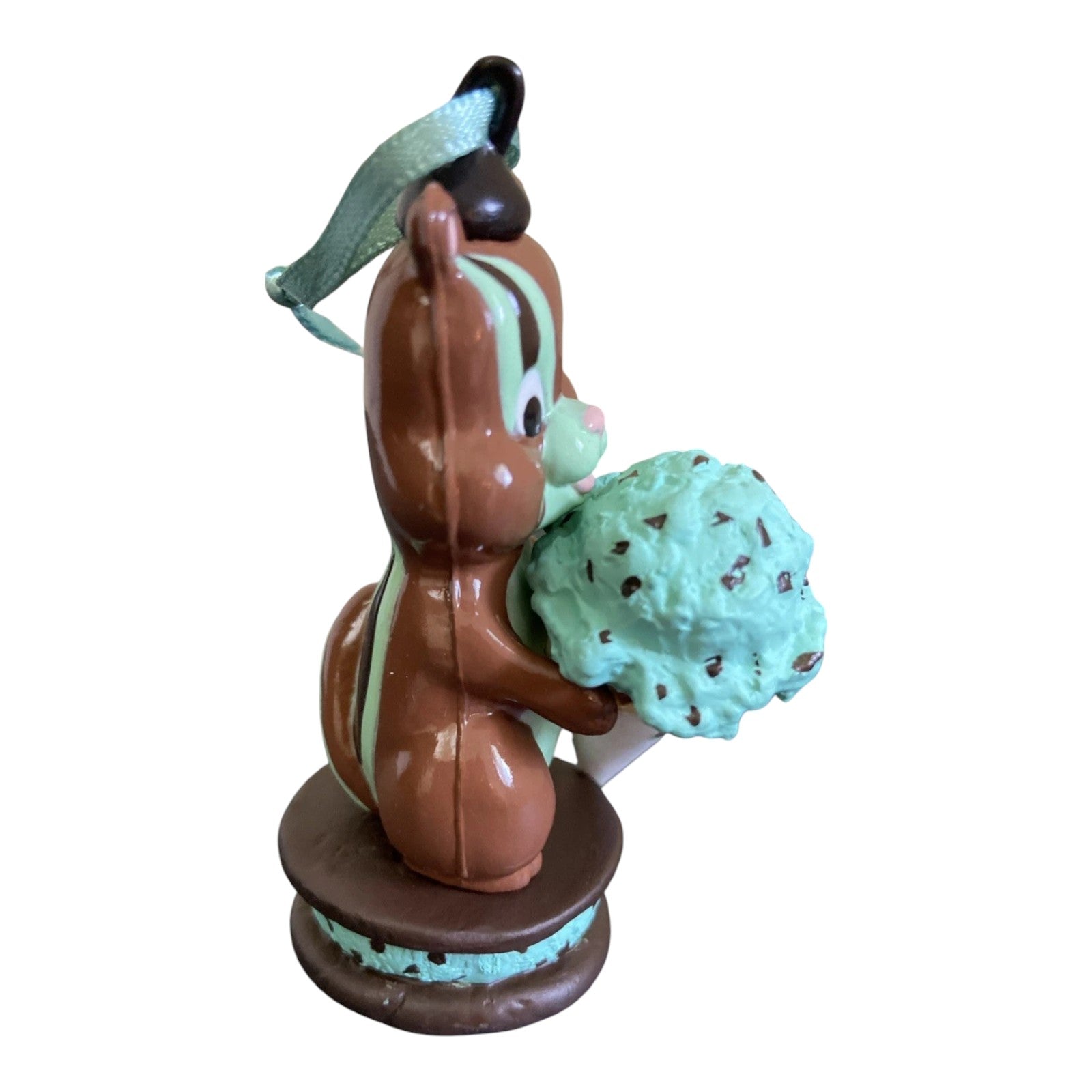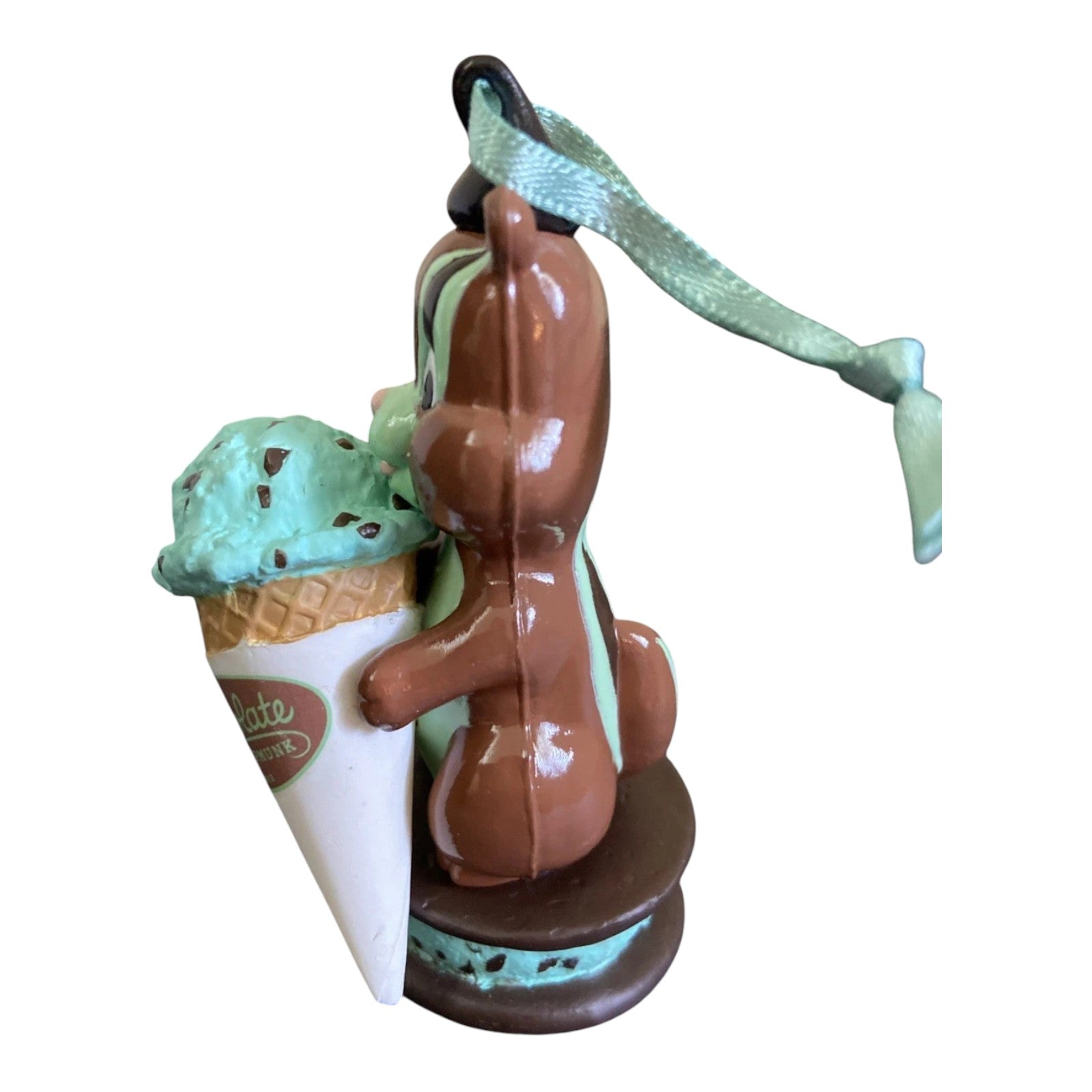 This ornament features a whimsical chipmunk perched atop a mint‐chocolate‐chip ice cream cookie, eagerly nibbling a matching cone. Designed by artist Anita Marra Rogers, the piece incorporates mint-green stripes, a little hat fashioned like a chocolate kiss, and full-colour sculptural detail that evokes both sweetness and festive fun. The compact size makes it ideal for tree hanging, and its playful “ice-cream treat” motif fits well in dessert-themed or animal-themed collections.