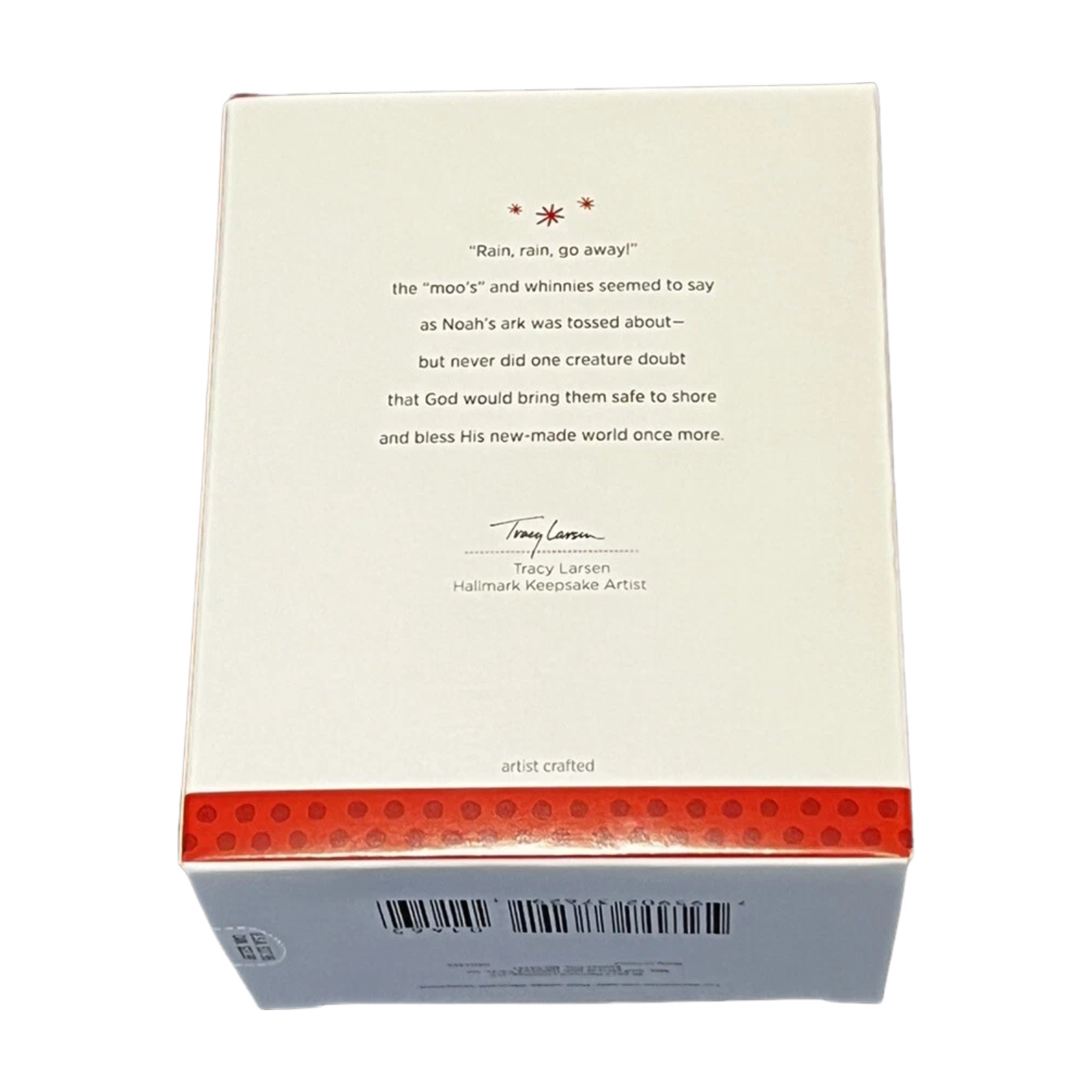 Reflect on the biblical story of promise and salvation with the 2013 Noah’s Ark Keepsake ornament from Hallmark. This design features Noah leading pairs of animals (elephants, giraffes, zebras, tigers, alligators, and more) up the ramp two by two as they board the ark, while some animals are already on board.