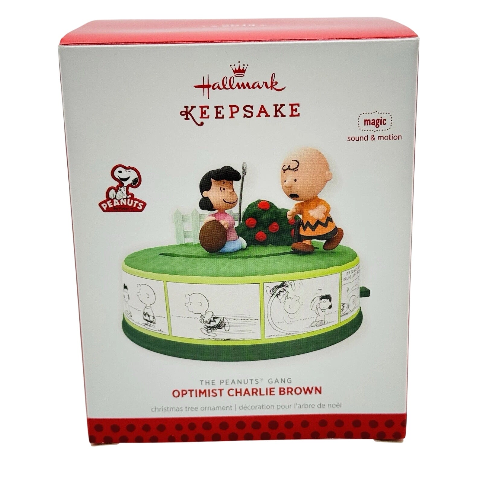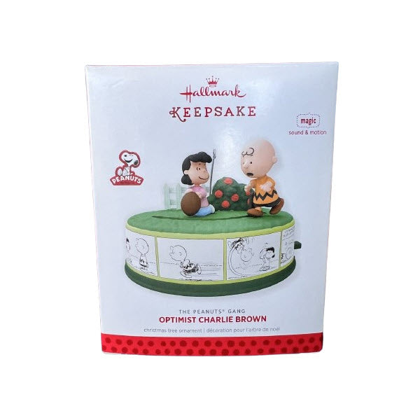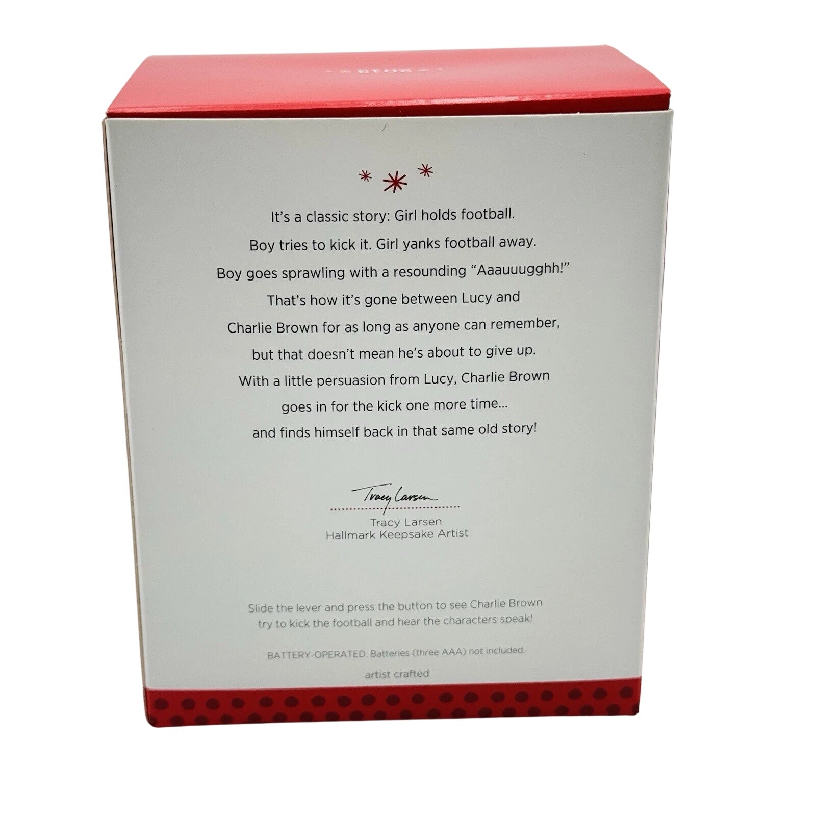 A heartfelt tribute to Charlie Brown’s unwavering optimism, this 2013 Optimist Charlie Brown ornament features Lucy holding the football and Charlie Brown stepping up for another try. Slide the lever and press the button to watch Charlie Brown attempt the kick while hearing the iconic football gag and his enduring spirit come to life. Battery-operated with three LR44 batteries included (3 AAA per some listings), this keepsake comes mint-in-box with tags and instructions.