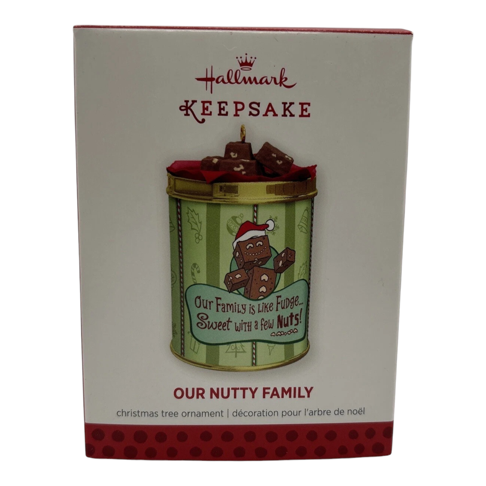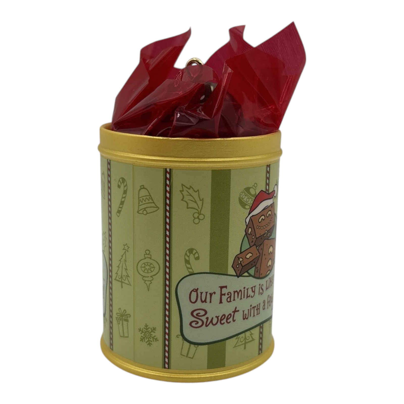 This collectible ornament features a whimsical design of a treat-tin styled piece with playful nut-and-fudge motif, complete with the inscription “Our family is like fudge… sweet with a few nuts!” on the front. Crafted by artist Tom Best and released in December 2013 as a Gold Crown exclusive. The piece measures approximately 2½″ high and evokes warm family-friendly humour and holiday baking nostalgia—ideal for tree-hanging or adding to a “family & friends” themed Keepsake collection.