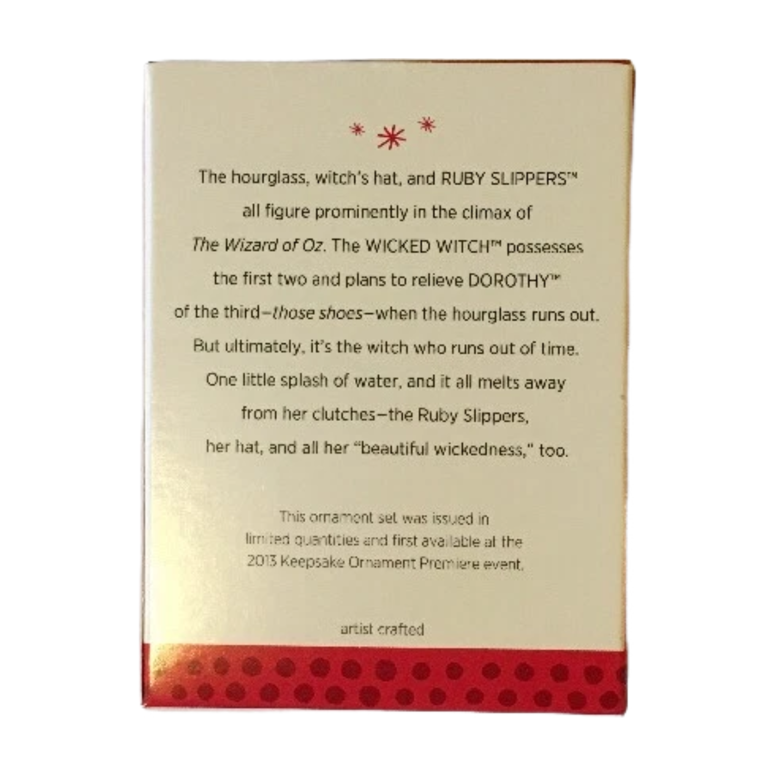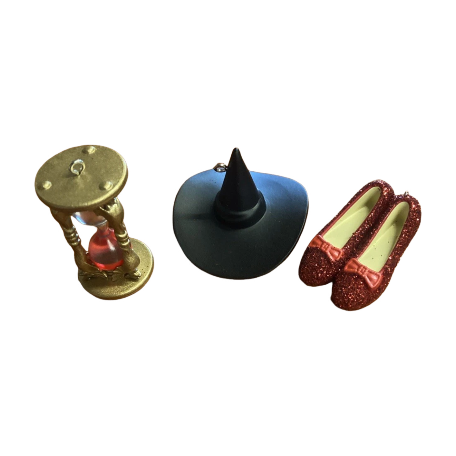 Travel back to the climactic moment in The Wizard of Oz with this 2013 Out of Time in Oz ornament set — a limited-edition miniature pack that captures three iconic symbols from the film. The set includes three 1-inch-tall miniatures: the Wicked Witch’s pointed hat, the ruby slippers once worn by Dorothy, and the hourglass that counts down the Witch’s time.