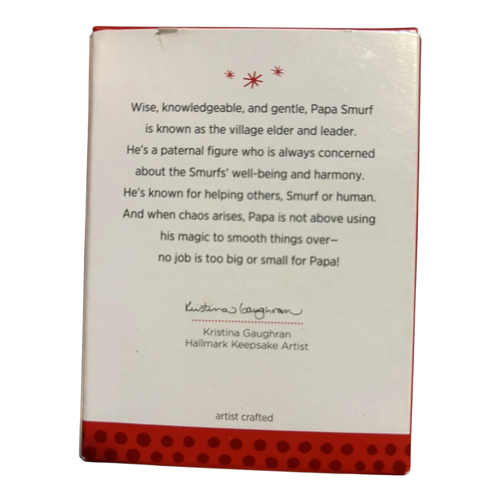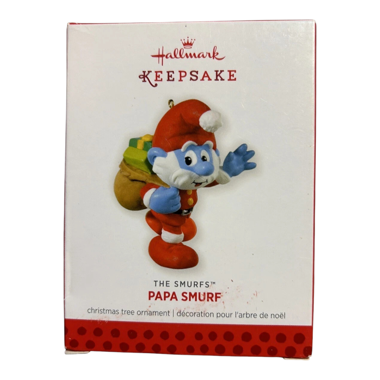 Bring the wisdom and warmth of Papa Smurf to your holiday tree with 2013 Papa Smurf. In this Keepsake ornament, Papa Smurf dons a red Santa hat and cloak and carries a sack of gifts, stepping into the role of the gift-giver for all the Smurfs on the “nice list.” Made of molded resin/plastic with detailed paint, it comes packaged in its original gift box. No batteries, cords, lights, or sound needed — just charming Smurf spirit and festive cheer.