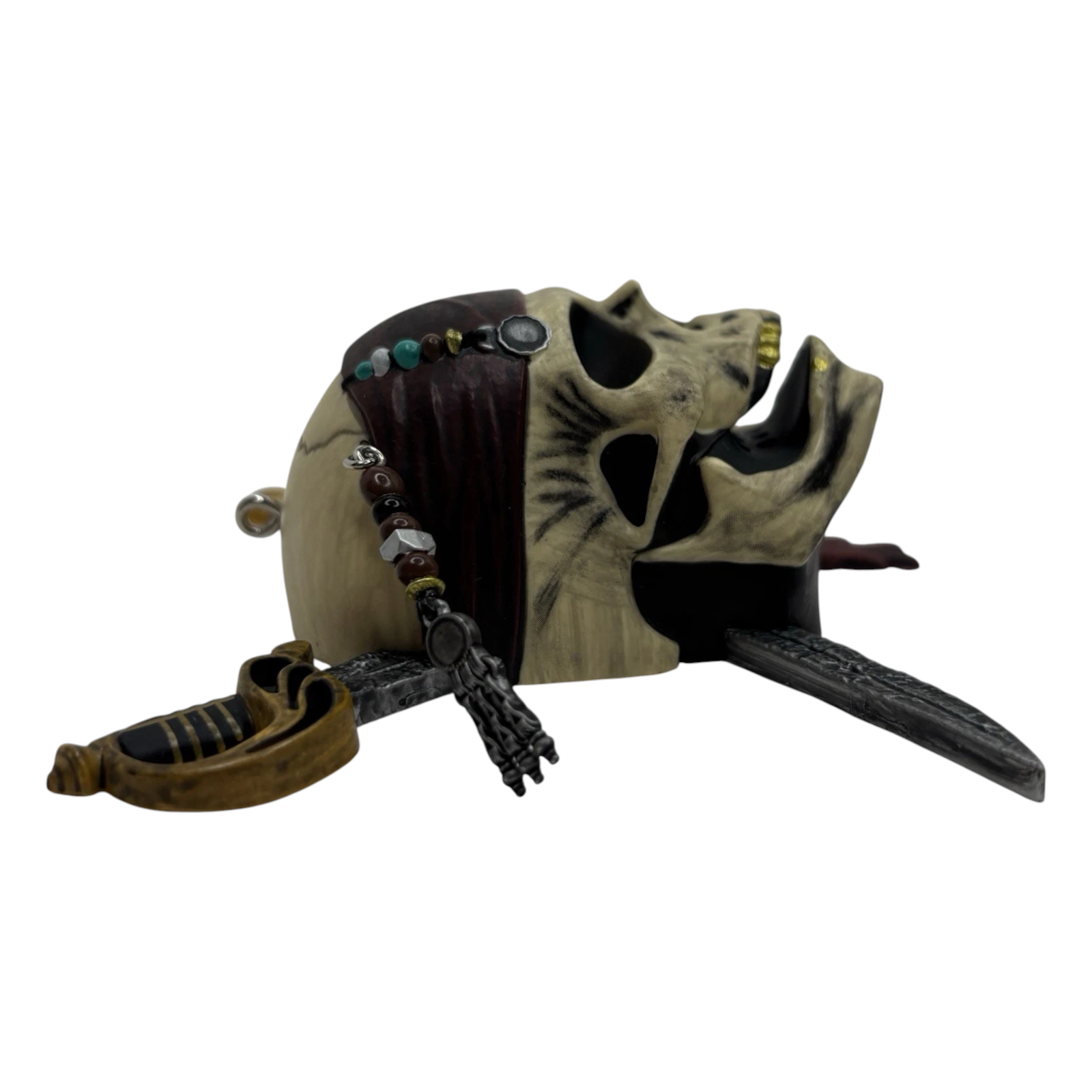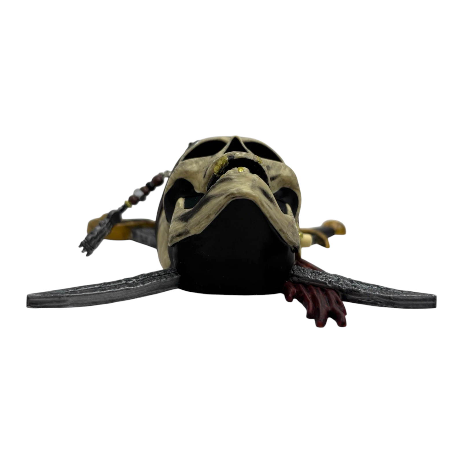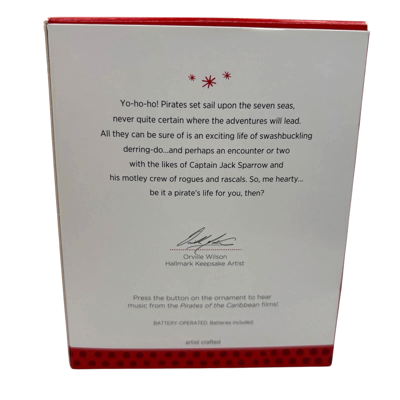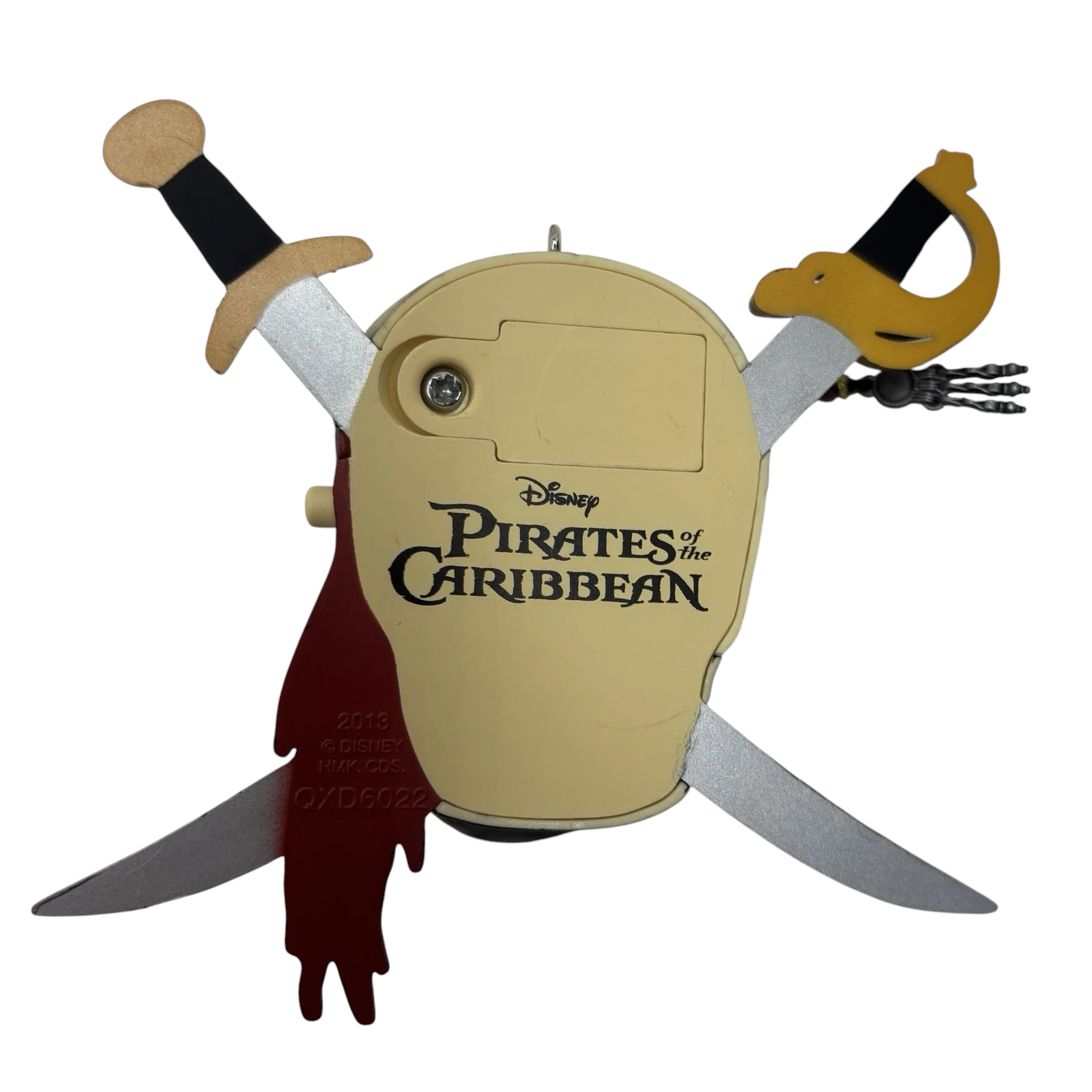This 2013 Hallmark Keepsake ornament features a dramatic skull with crossed swords, wrapped in pirate flair for fans of Pirates of the Caribbean. Designed by Orville Wilson, it includes a sound module: pressing a knob on the ornament plays the iconic theme music from the Pirates of the Caribbean movies. Made of painted resin/plastic, the ornament comes with its original box in mint-condition examples. Requires replaceable batteries to power its music feature.