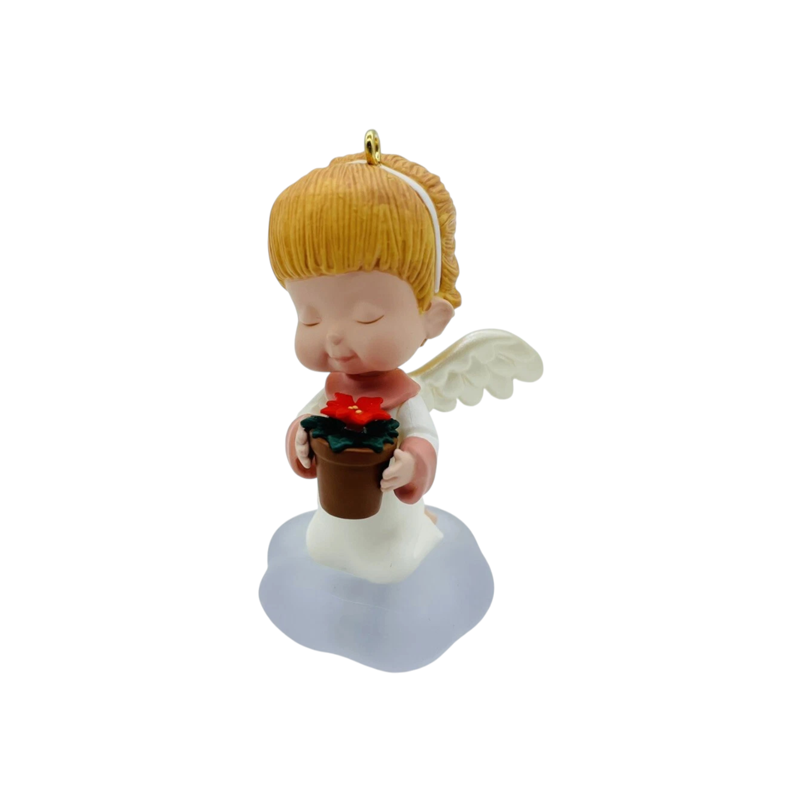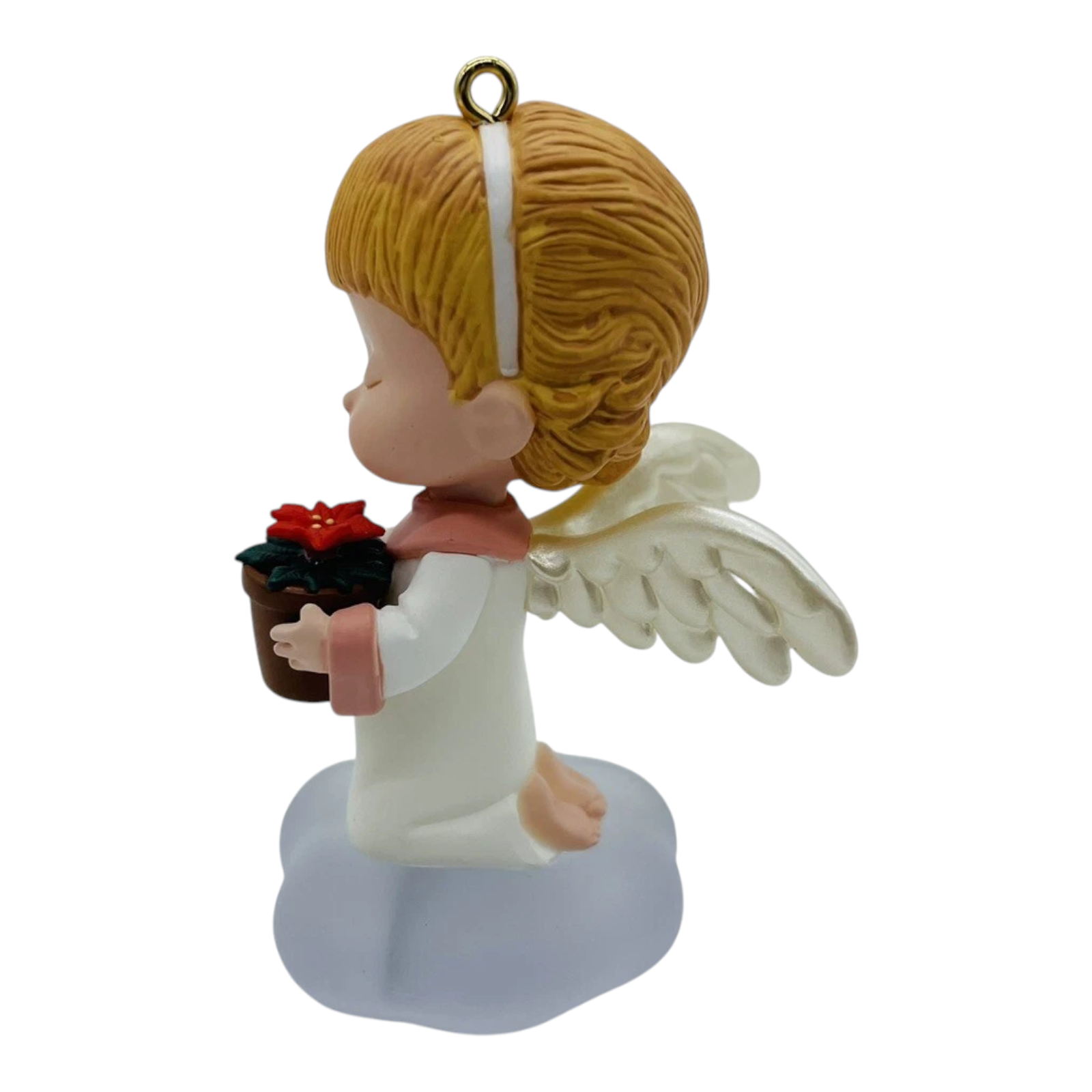 Celebrate the beauty and serenity of the season with this tender ornament from Hallmark’s beloved Mary’s Angels series. The 2013 edition, Poinsettia, features a sweet angel seated gracefully on a cloud, holding a bright red poinsettia flower — the cherished “flower of the holy night.” Dressed in a flowing white robe, the angel radiates warmth and peace, making it a heartwarming addition to any Christmas tree. The ornament comes in its original Hallmark box and is ready to hang. No batteries, cords, or lights are required.