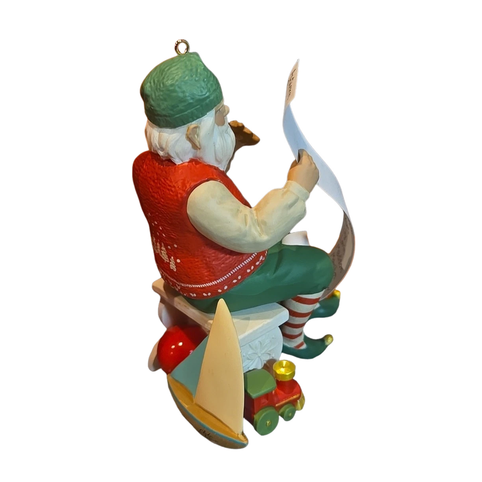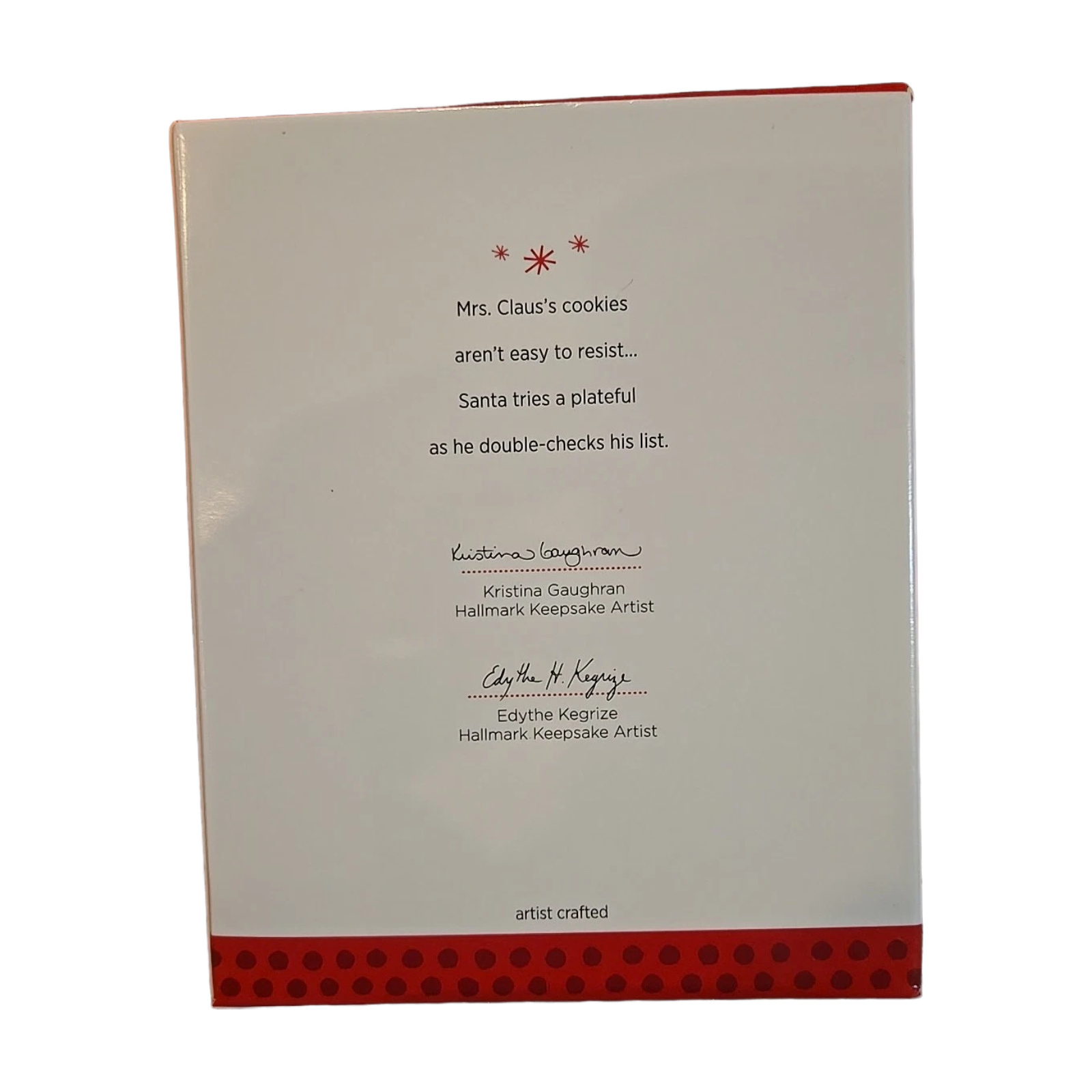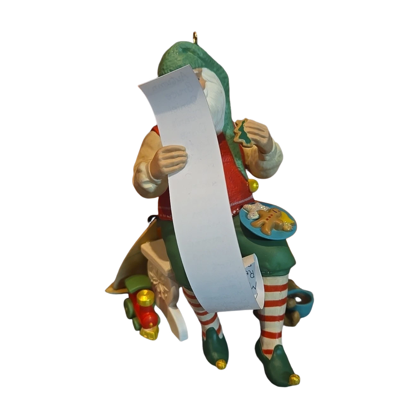 This collectible ornament depicts Santa Claus pausing for one last check of his naughty-and-nice list while enjoying a festive plate of cookies — a charming “pre-take-off” moment before his sleigh journey. Created as a club-exclusive piece, it features sculpted detail and festive colour in a hanging ornament format that fits a holiday tree or display. Designed by artists Edythe Kegrize & Kristina Gaughran, it appeals to collectors of themed Santa figurines and membership-only Hallmark Keepsake editions. Released in 2013 as part of the Keepsake Ornament Club series.
