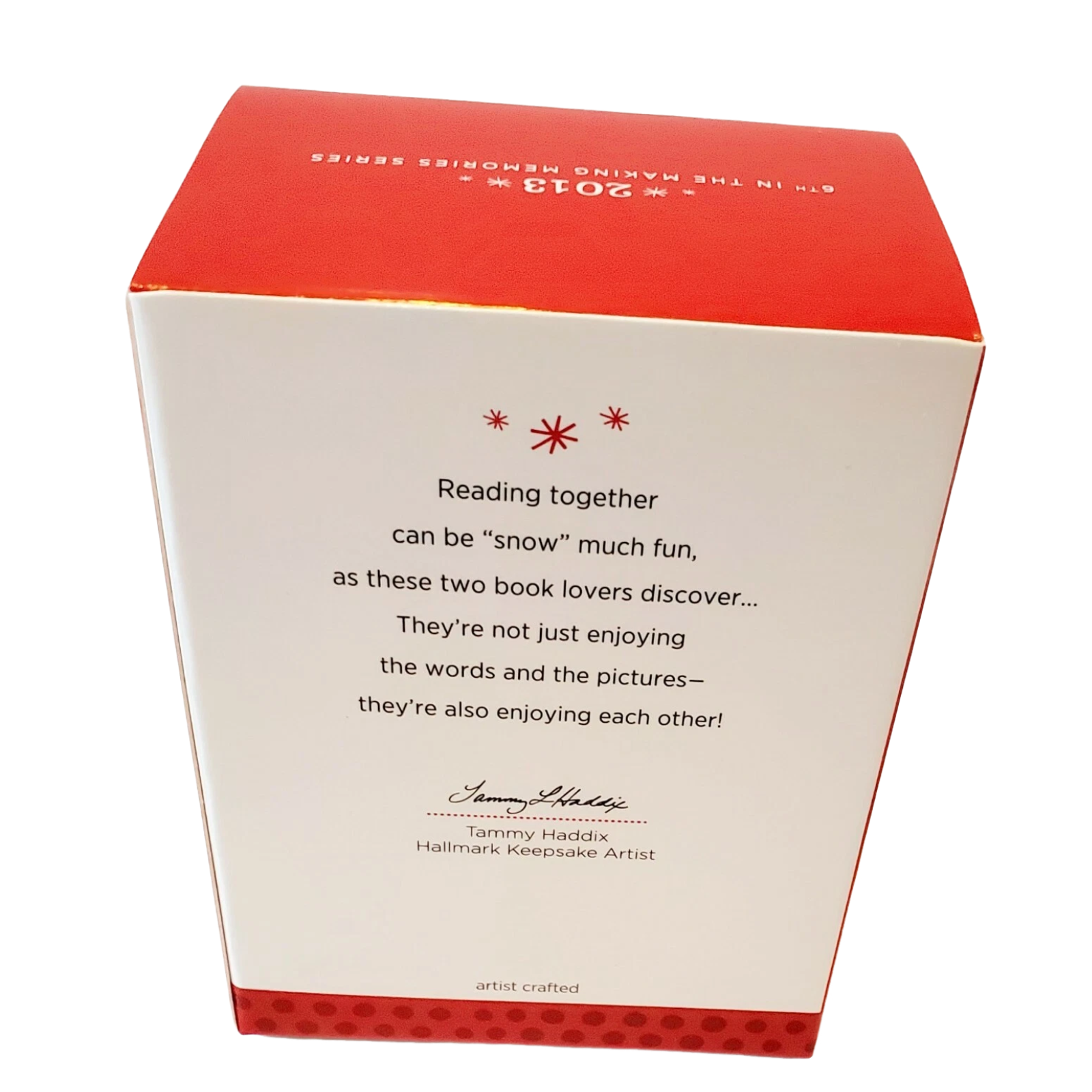 Capture the nostalgic warmth of storytime with Reading Is “Snow” Much Fun!, the sixth ornament in Hallmark’s beloved Making Memories series. Designed by Tammy Haddix, this charming scene features a snow-parent and snow-child cozily reading together, accompanied by a curious snow-cat. The exterior reads “There’s Snow Stopping Us Now!”, while the inside reveals a festive tale: “’Twas the day of the annual Mount Icy Run and the whole town of Snowbelt was ready for fun.” No power or cords are needed—just hang and enjoy a tale of holiday imagination and joy.