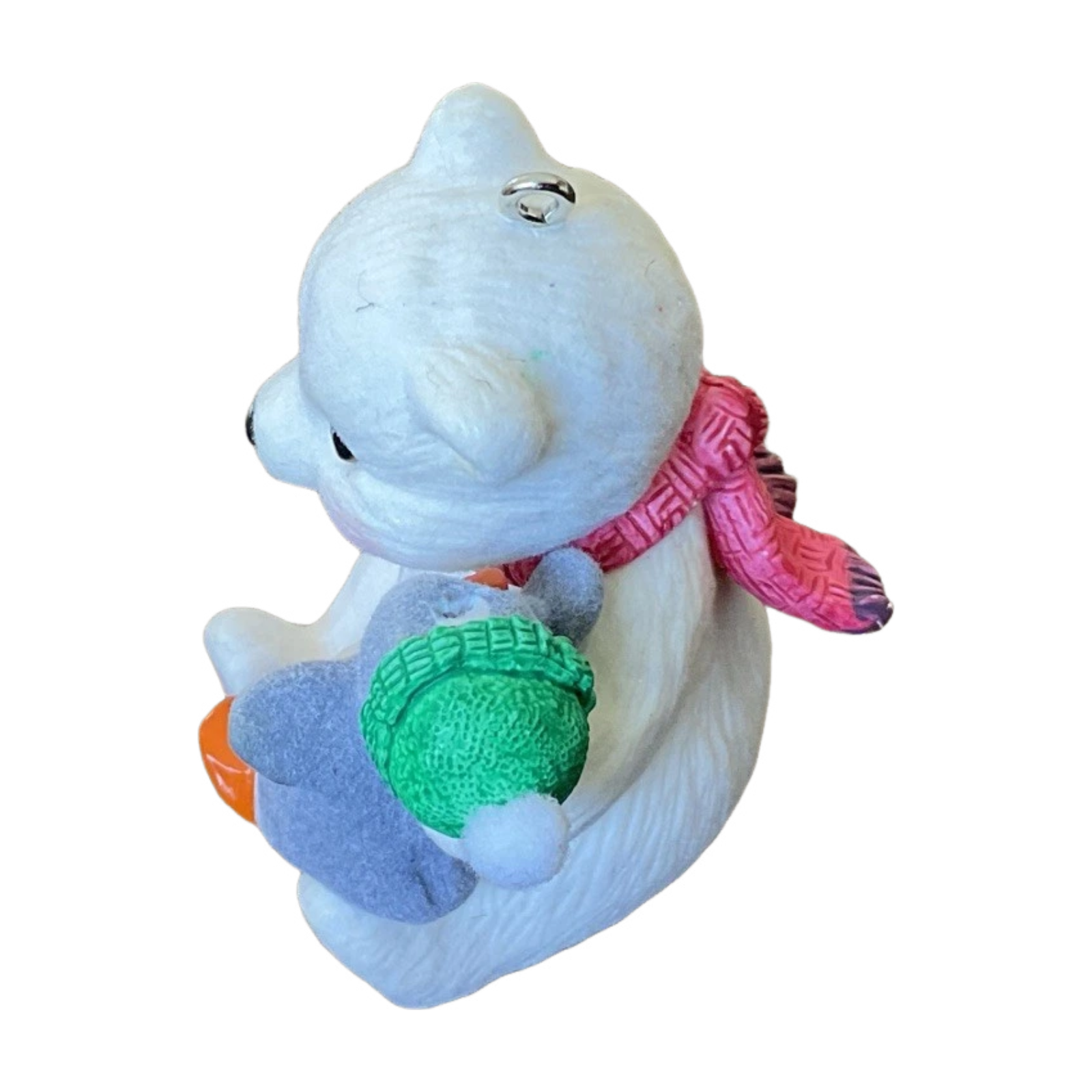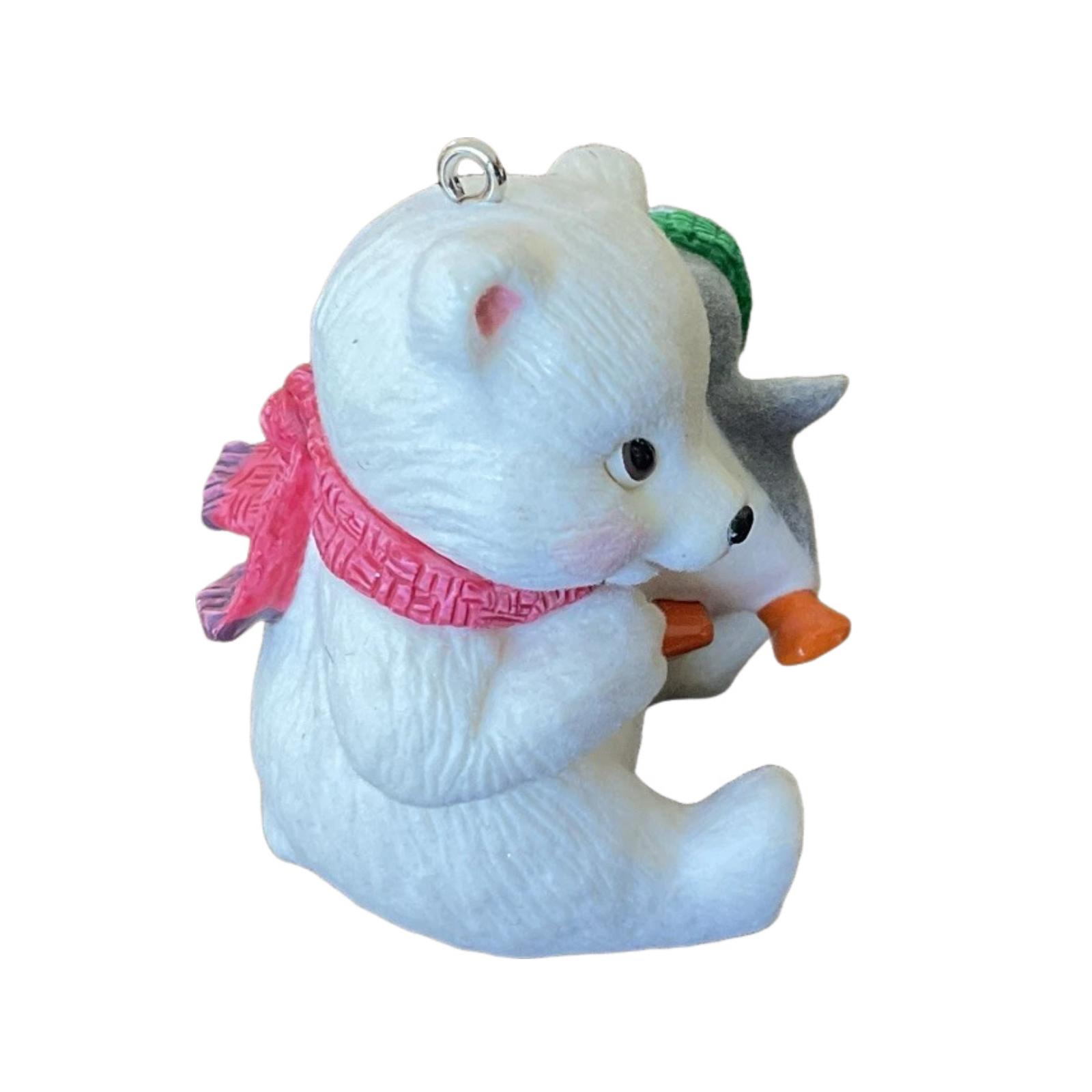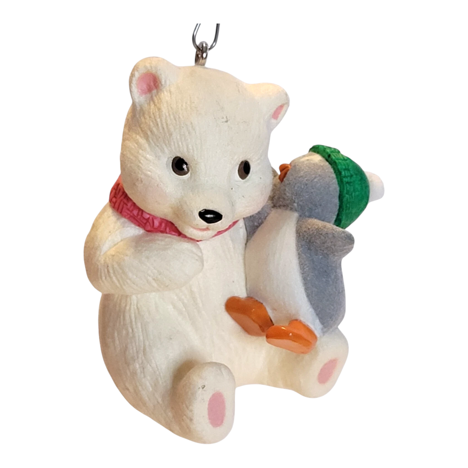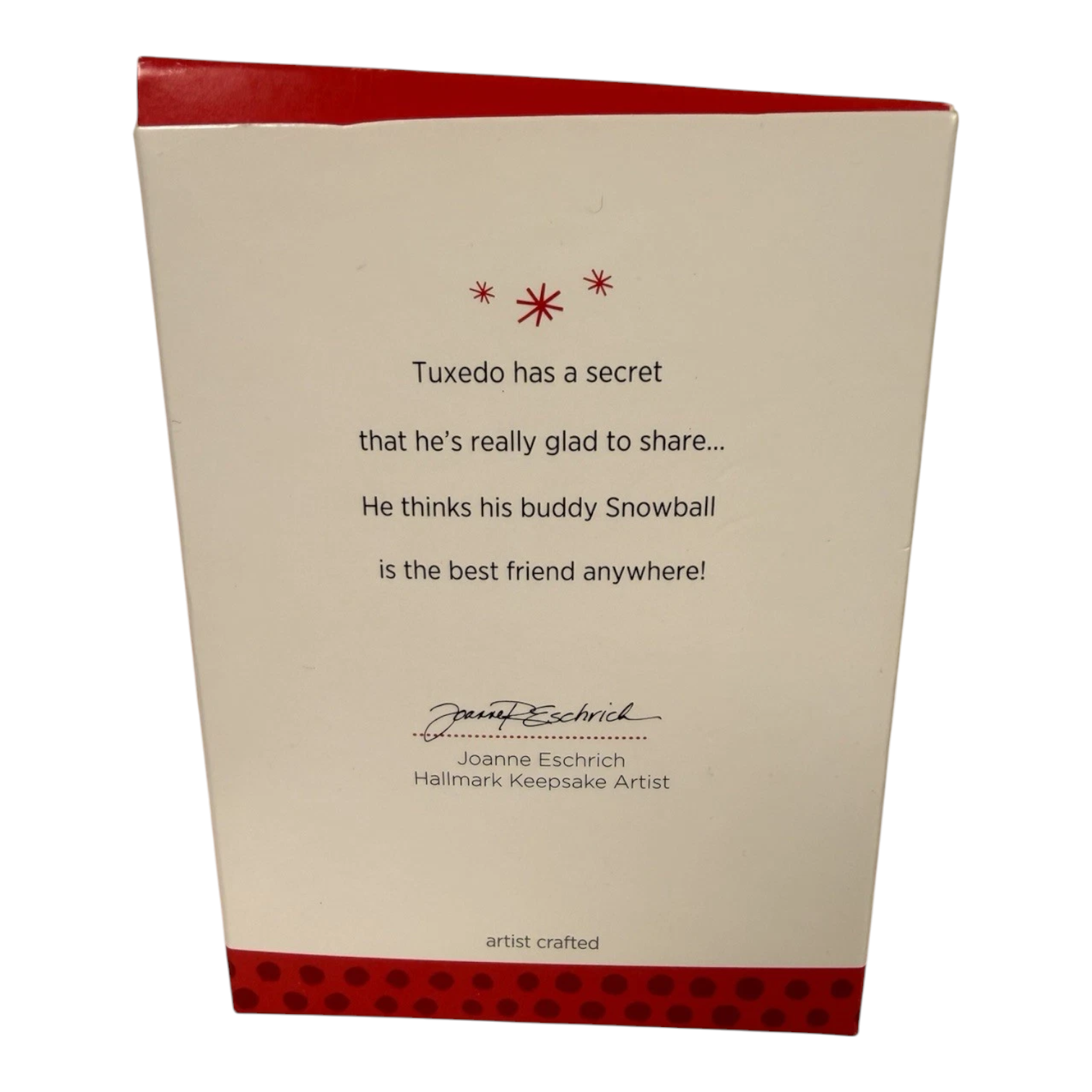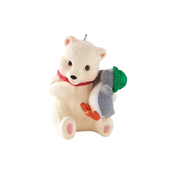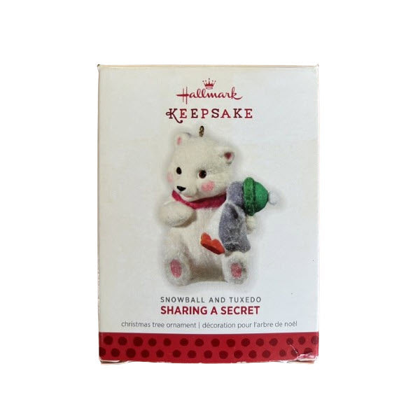 In this heartwarming 2013 Sharing a Secret (Snowball and Tuxedo) keepsake, Tuxedo the penguin leans in and whispers a secret into Snowball the polar bear’s ear, while Snowball listens with a cozy red scarf and sweet smile. This adorable miniature piece is the 13th installment in the Snowball and Tuxedo series, crafted by artist Joanne Eschrich. It comes complete with its original box and hang tag, and requires no batteries, cords, or light strings—ready to hang and delight immediately.