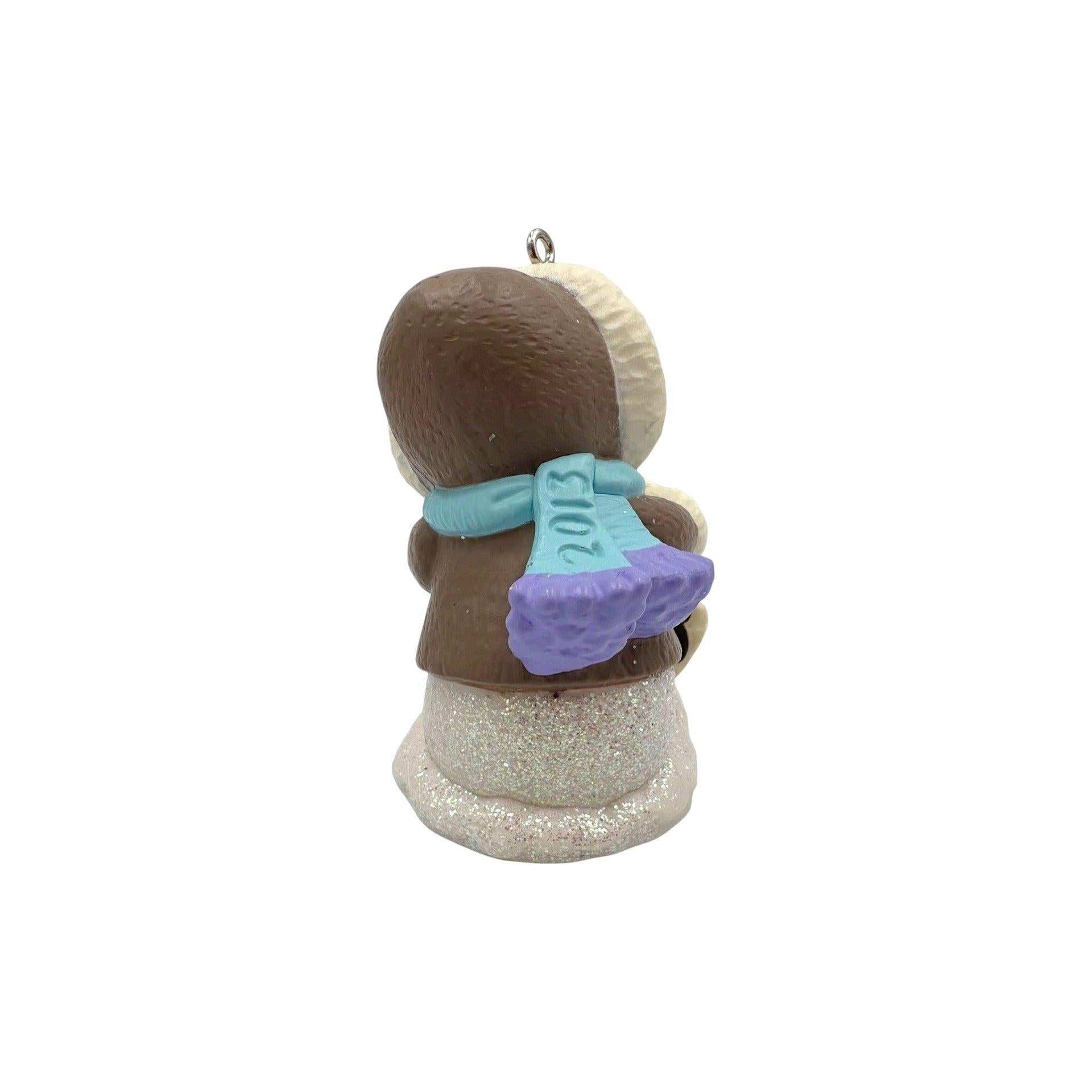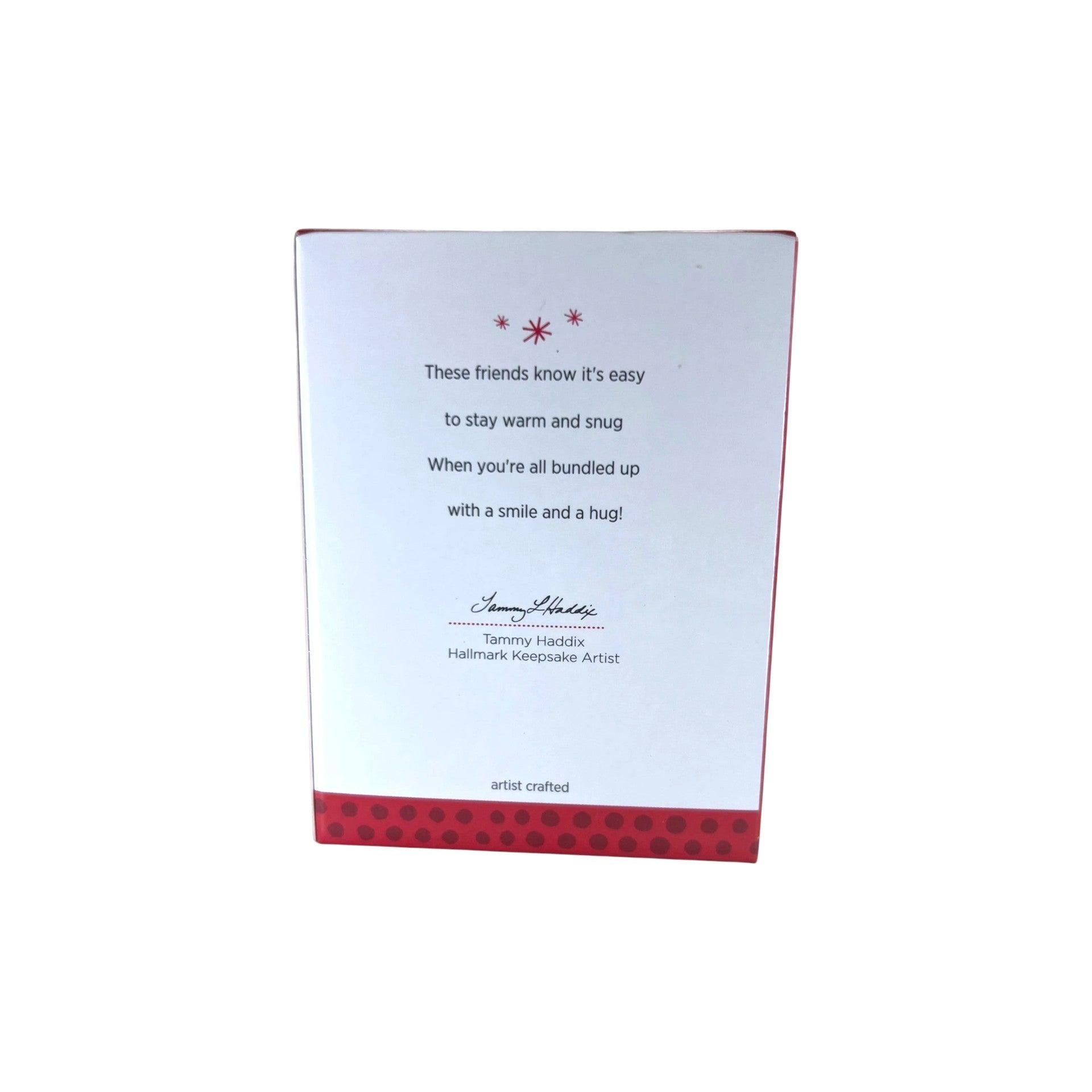 This 2013 ornament—the 16th release in the Snow Buddies series—features a bundled-up snowman in a brown parka with aqua scarf, joyfully holding hands with a baby polar bear atop a glittery snowy base. Designed by Tammy Haddix from resin with sparkling accents, this charming keepsake arrives in its original Hallmark box complete with tag and memory card. It requires No Power Needed—no lights, motion, or sound—ready to hang straight from the box.