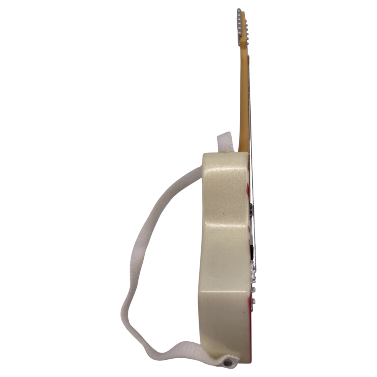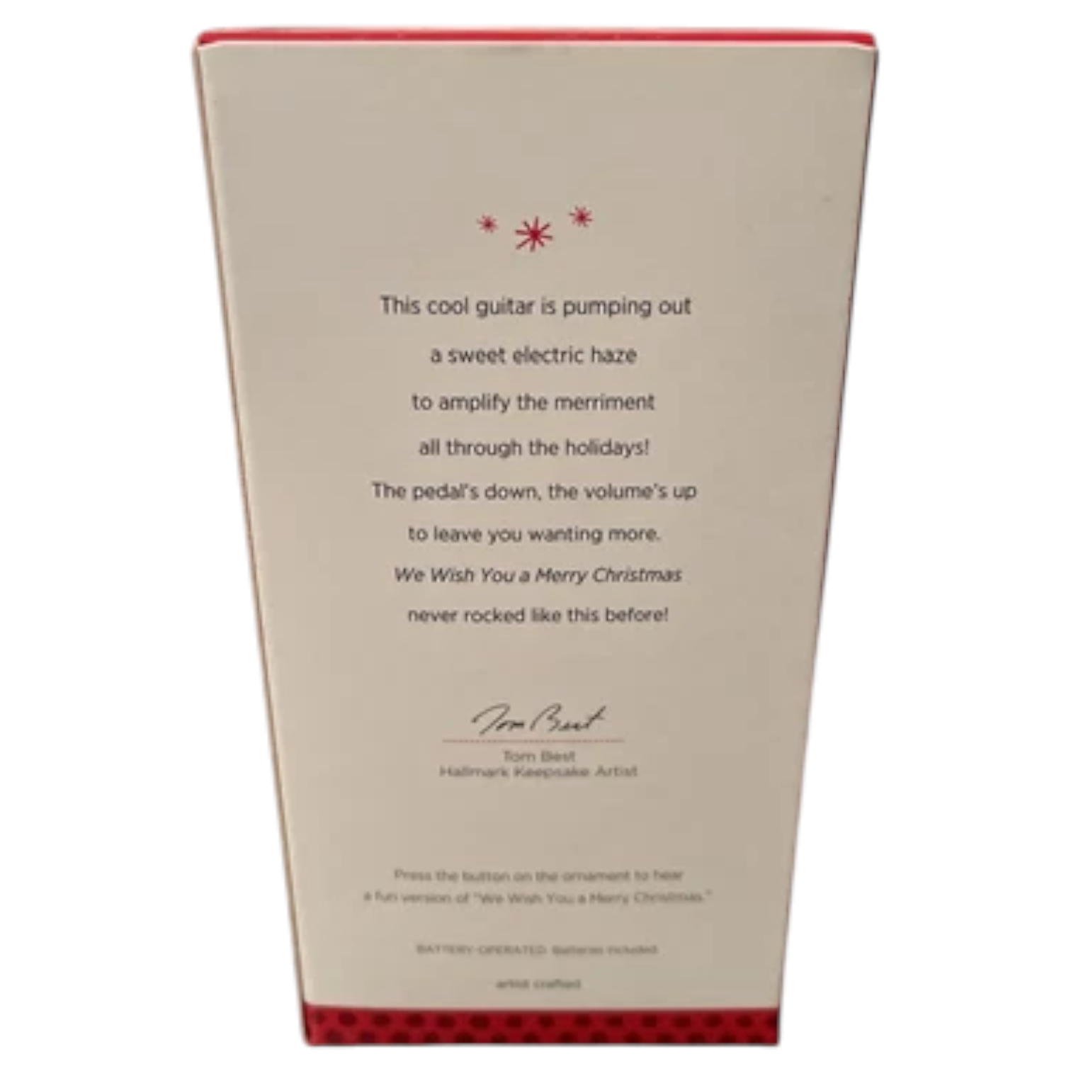 This festive ornament features a candy-cane-striped electric guitar shaped design that cries out “rock around the Christmas tree” with holiday flair. A press of the button triggers a fun version of “We Wish You a Merry Christmas,” making it a musical highlight for your décor. With its bold red-and-white finish, fretboard detail, and compact guitar-form factor, it appeals to collectors of music-themed or instrument-themed ornaments. Released in 2013 as part of the “Magic” line by Hallmark, the piece’s combination of novelty, sound feature and holiday theme makes it especially collectible for fans of musical keepsakes.