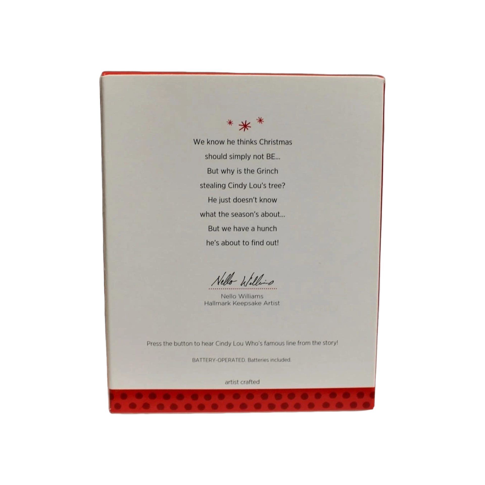 This charming 2013 Hallmark ornament captures the unforgettable moment from How the Grinch Stole Christmas! where Cindy-Lou Who catches the Grinch in the act of stealing the Christmas tree. Sculpted with expressive detail, the scene features the Grinch disguised as Santa, bending beside the tree as Cindy-Lou looks up with innocence and curiosity. Bright colors, classic Seuss styling, and nostalgic storytelling make this a must-have ornament for Grinch fans. The ornament includes the full sculpted scene and typically the original Hallmark Keepsake box when available. No power accessories are required.