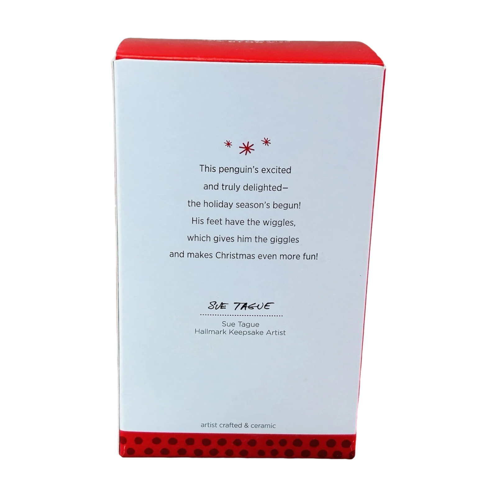 This collectible ornament features a cheerful penguin wearing a cozy winter hat and a red polka-dot scarf, with yellow feet that “wiggle” to make him “giggle”—a playful detail that adds movement and charm. On his cap is printed “Snow Time Like Christmas” and on his belly are engraved the words “Wiggles” and “Giggles.” Sculpted and painted in fine detail, the design captures a lively holiday moment with a whimsical character appeal. Issued as a club exclusive for the 2013 year, it holds special appeal for collectors who appreciate limited-availability and member-only releases. This figure is designed to hang on a tree, adding both personality and seasonal spirit to a display.