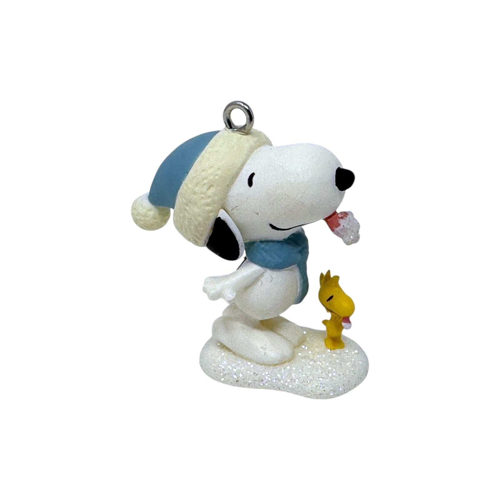 Catch the magic of childhood winter play with the 2013 Winter Fun with Snoopy miniature ornament – the 16th edition in Hallmark’s Winter Fun with Snoopy series. This charming piece features Snoopy and Woodstock catching snowflakes on their tongues, set on a glittery snow base. Crafted from durable plastic by artist Tracy Larsen, the ornament stands about 1″ tall, comes mint-in-box with its original tag, and requires No Power Needed—perfectly suited for tabletop trees or festive vignettes
