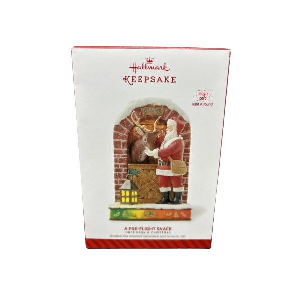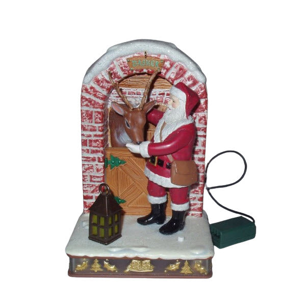 Delight in the magic of Christmas Eve with this charming 2014 ornament from the beloved Once Upon A Christmas series. Santa is captured feeding Dasher a treat in front of a cozy brick stable, complete with a snow‑topped roof and glowing lantern. The package includes the ornament in its original box with pop‑out instruction tag. Pair it with Hallmark’s Magic Cord (sold separately) to enjoy synchronized lights and “Jingle Bells” music—no batteries required.