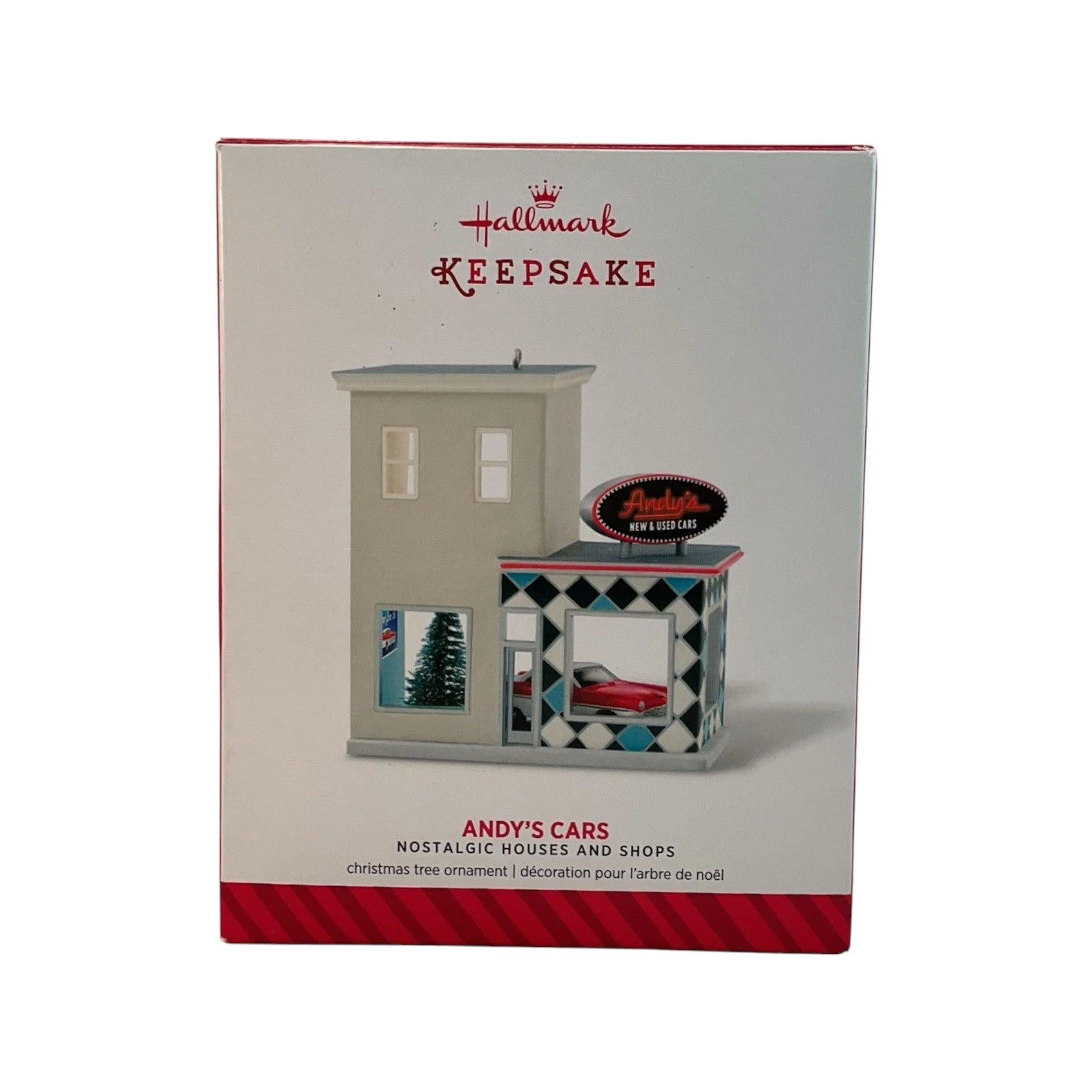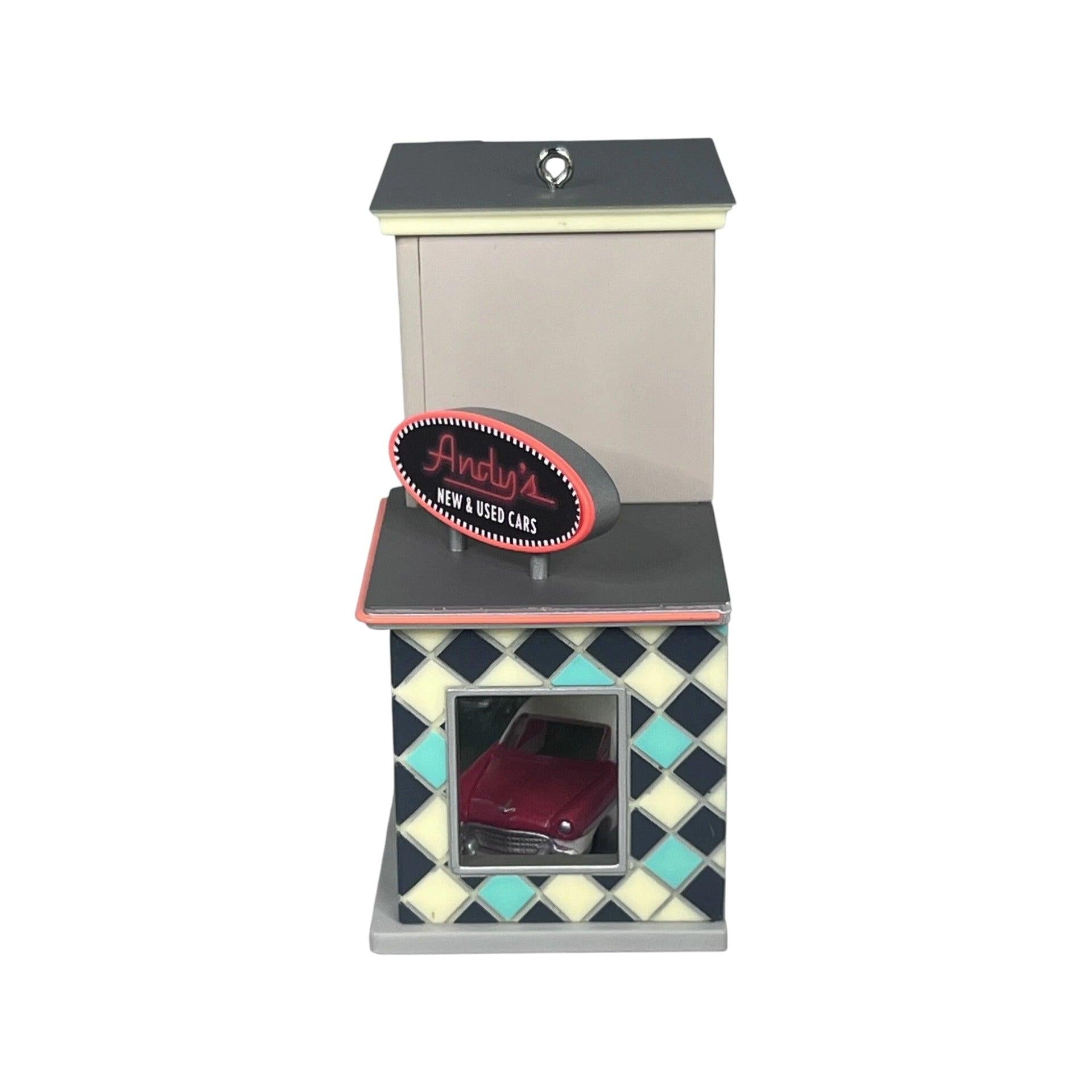 Revive retro holiday vibes with the 2014 Andy's Cars ornament, part of the “Nostalgic Houses and Shops” collection. This charming piece showcases a two-story car dealership—complete with a vivid red car in the showroom window and a Christmas tree nestled inside. Crafted from durable plastic and designed by Don Palmiter, it arrives mint in box with its tag and requires No Power Needed—no batteries, cords, or lights.