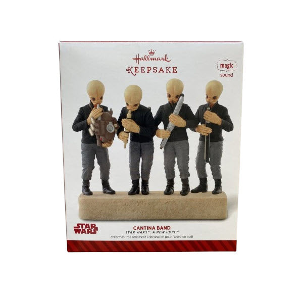 Bring the melodious rhythm of Mos Eisley’s classic house band to your holiday décor with this 2014 Hallmark Keepsake Magic ornament. Featuring the four Alien musicians in mid-performance, a discreet button plays the iconic Cantina tune while tiny built‑in lights glow., this interactive treasure includes 2 LR44 batteries, and requires no cords, arriving mint‑in‑box with tags—ready to delight the whole season.