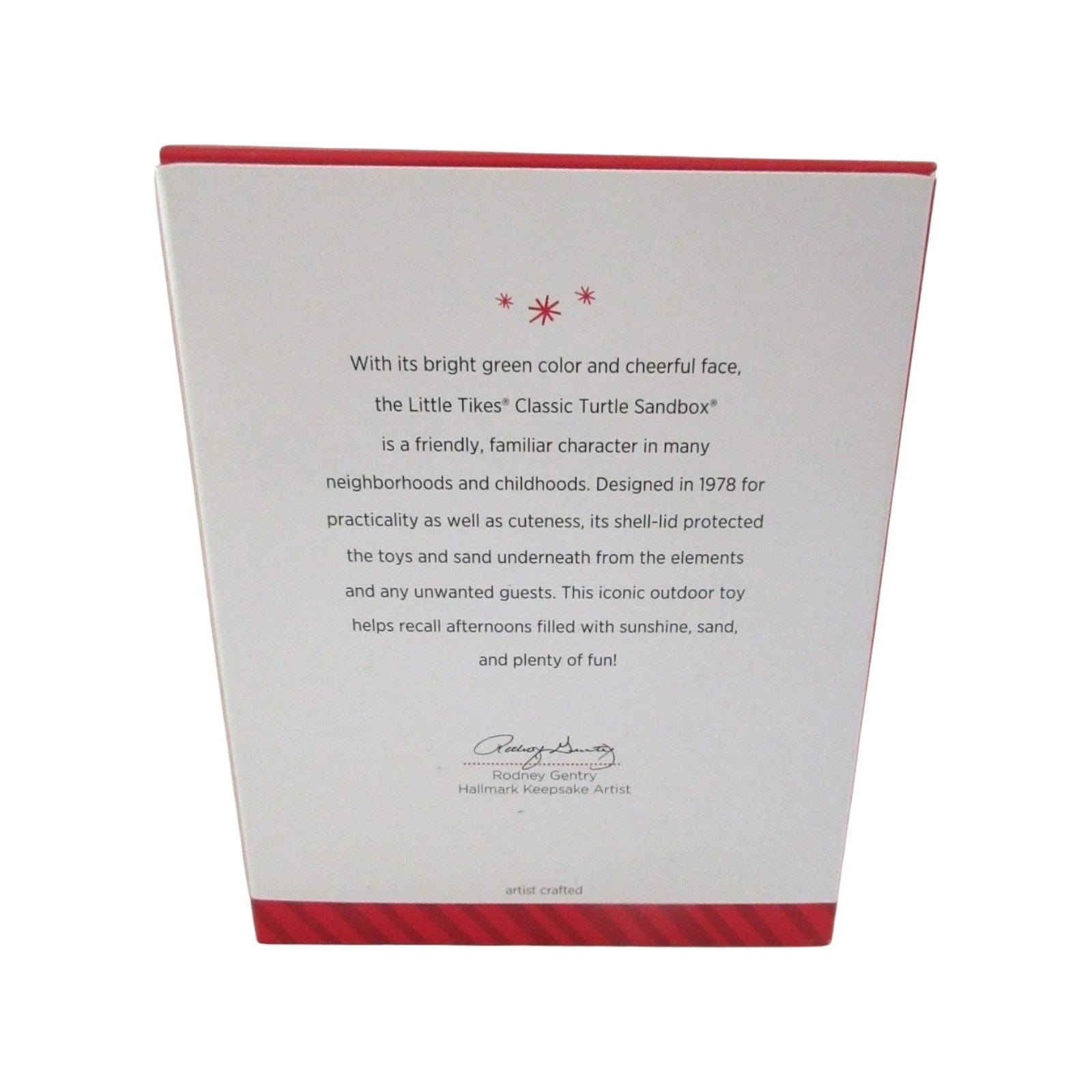 This nostalgically designed 2014 Hallmark Keepsake ornament captures the classic Little Tikes turtle sandbox, complete with sculpted toys and a lid featuring playful hand-prints—a miniature tribute to summer memories and carefree childhood play. Crafted by artist Rodney Gentry, it arrives in its original packaging and is ready to hang—no batteries, cords, or accessories required to enjoy its charm.