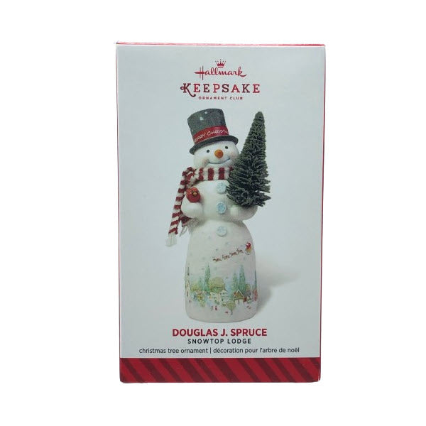 Introducing Douglas J. Spruce, a distinguished addition to Hallmark’s beloved Snowtop Lodge collection, debuting in 2014 as a Gold Crown Club exclusive (Item QXC5113). This elegant snowperson wears a top hat inscribed “Merry Christmas,” holds a petite spruce tree, while a bright red cardinal perches on their hand. The scenic porcelain base features a nostalgic small‑town winter scene—including Santa and his reindeer making their nightly delivery. Mint-in-box offerings include the ornament, collector’s box, tag, and hanging loop. Fully decorative—no batteries, cords, or lighting needed