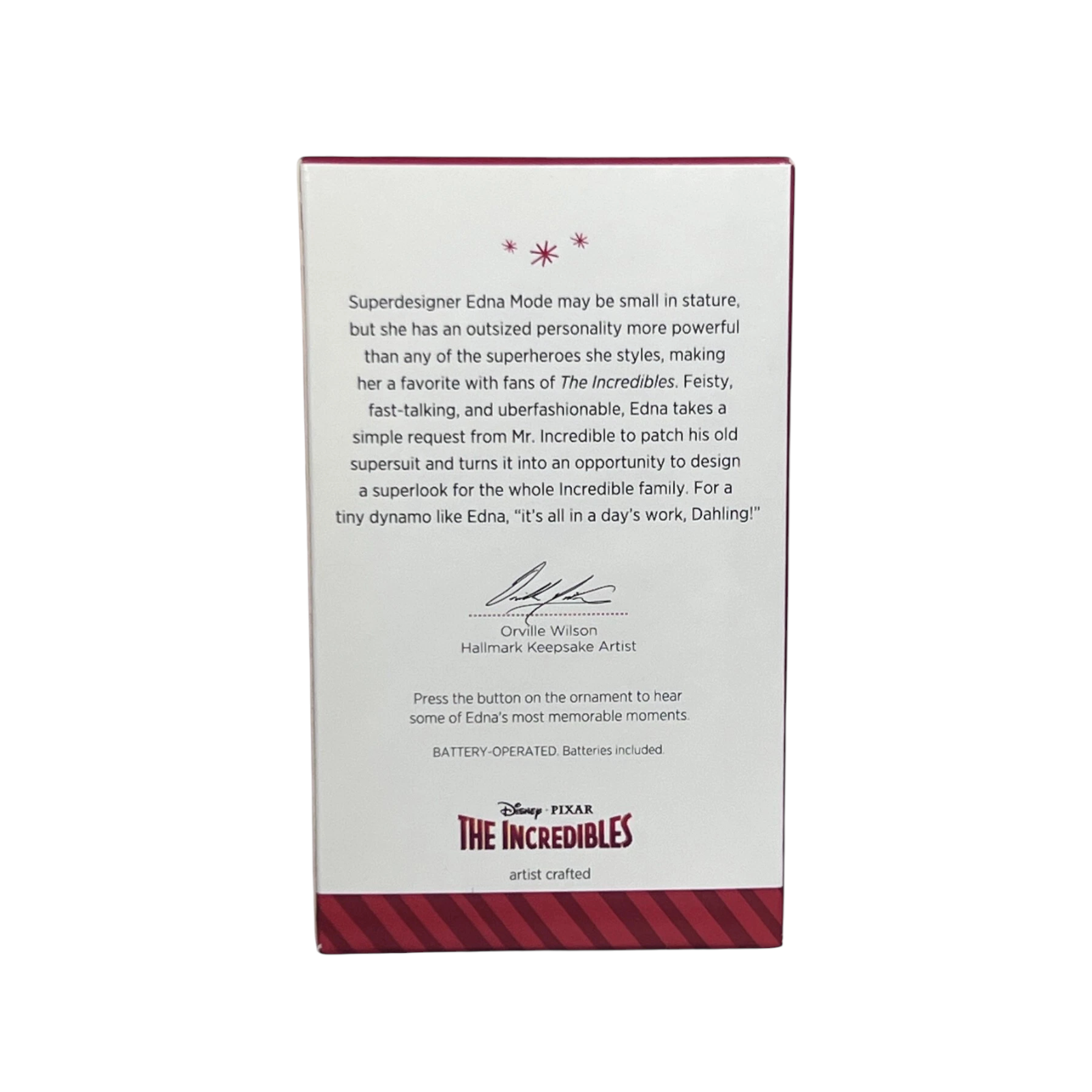 Elevate your holiday display with this fabulous 2014 Keepsake ornament featuring the unforgettable Edna Mode, celebrated designer for the Super family. This piece is the fourth release in Hallmark’s Disney·Pixar Legends series, brought to life in detailed plastic by artist Orville Wilson. Press the discreet button to hear some of Edna's most iconic lines—her humor and flair shine through every year. Arrives mint in box, ready for gifting or collecting.