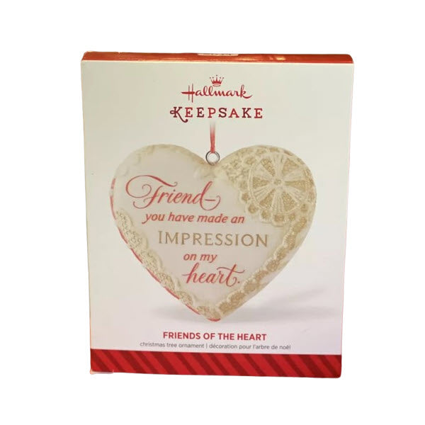 This collectible ornament features a beige heart adorned with delicate lace-style embossing and the heartfelt message: “Friend – you have made an impression on my heart.” Released for the 2014 holiday season, the design by Julie Forsyth evokes timeless sentiment of friendship and appreciation. The compact size makes it perfect for hanging on a Christmas tree, gifting to a cherished friend, or adding to a “friends & hearts” themed collection.