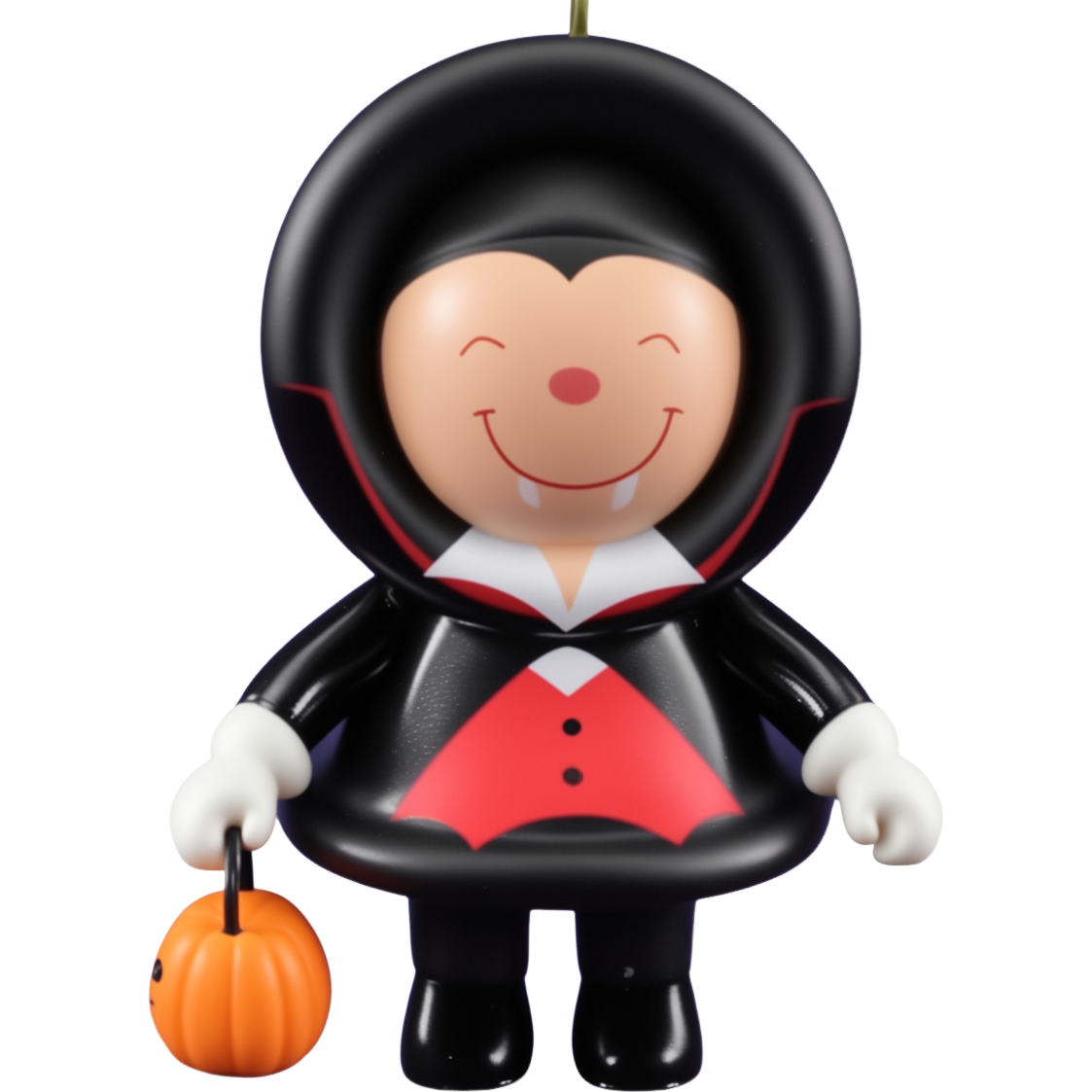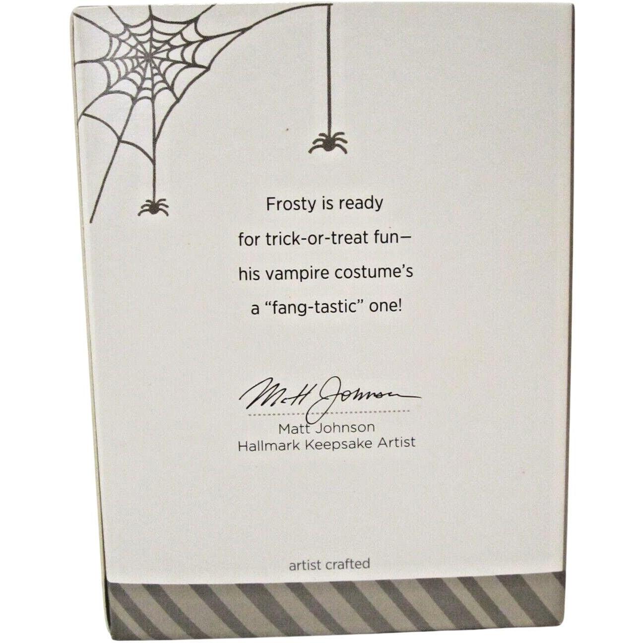 Add a playful, spooky twist to your decor with 2014 Frosty Halloween Fun. This ornament features Frosty dressed up in a vampire costume, complete with cape and fangs, holding a jack-o-lantern candy bucket—perfect for trick-or-treat nights. Designed by Matt Johnson as part of the Frosty Friends / Halloween collection, it stands about 3.01" high × 2.16" wide × 1.51" deep.