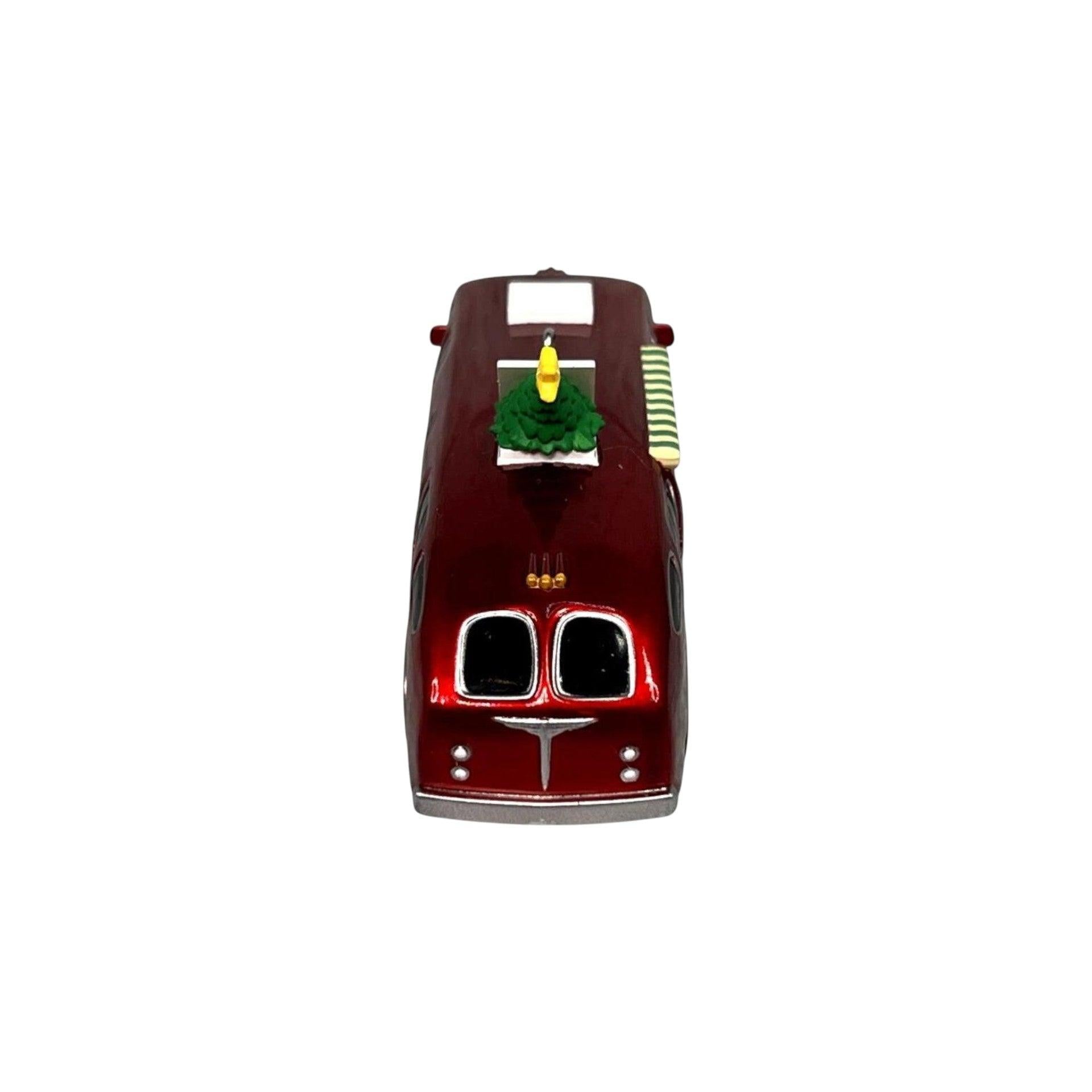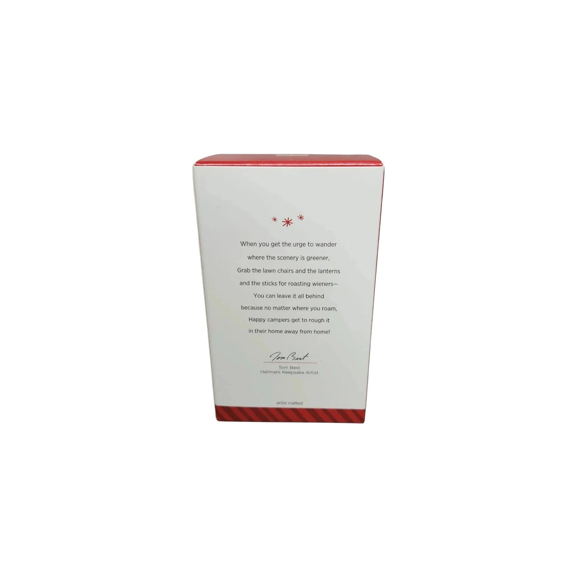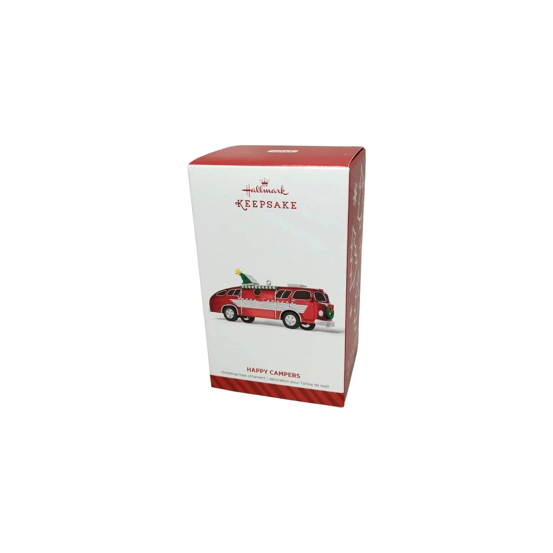 Hit the road to holiday cheer with the 2014 Hallmark Keepsake Ornament, "Happy Campers." Designed by artist Tom Best, this charming red travel van features a festive wreath on the front, a retractable green and white striped awning, and the words "Happy Campers" along the side. A Christmas tree with a gold star peeks out from the air vent, adding a whimsical touch. Measuring approximately 4½ inches in length and 2 inches in height, this ornament is in mint-in-box condition, complete with the original packaging and hanging tag. No batteries or cords are required—simply hang it on your tree to enjoy its delightful charm.