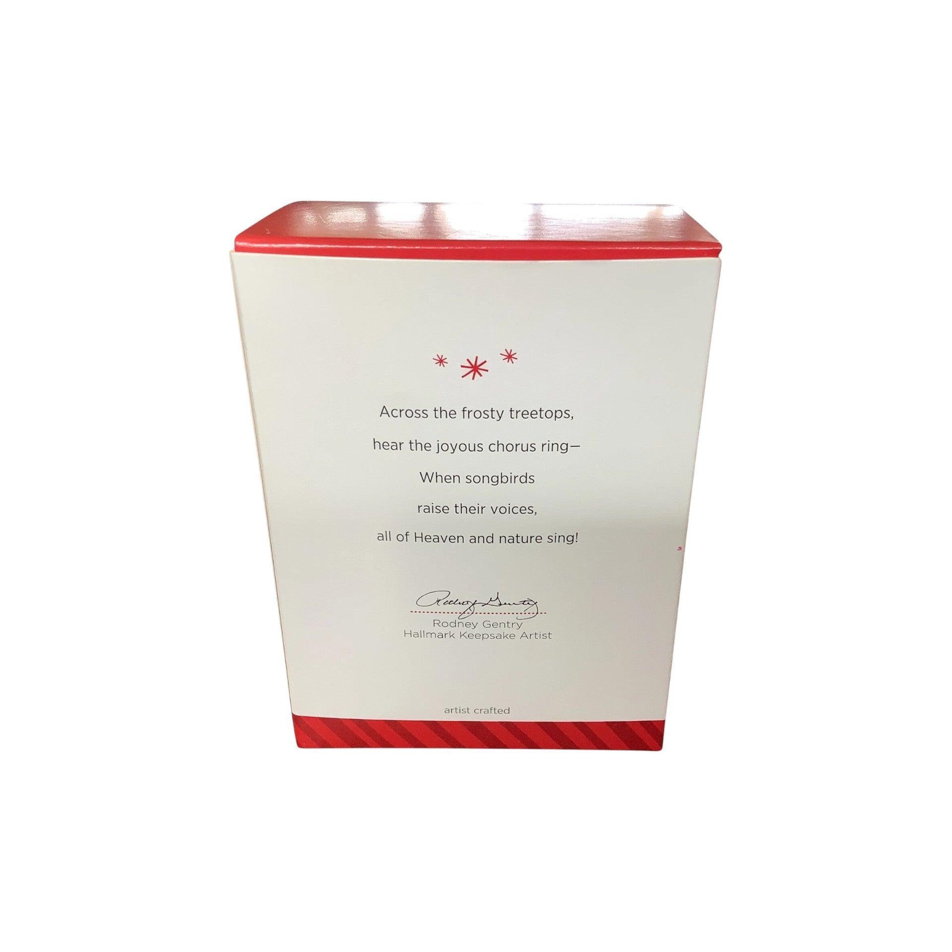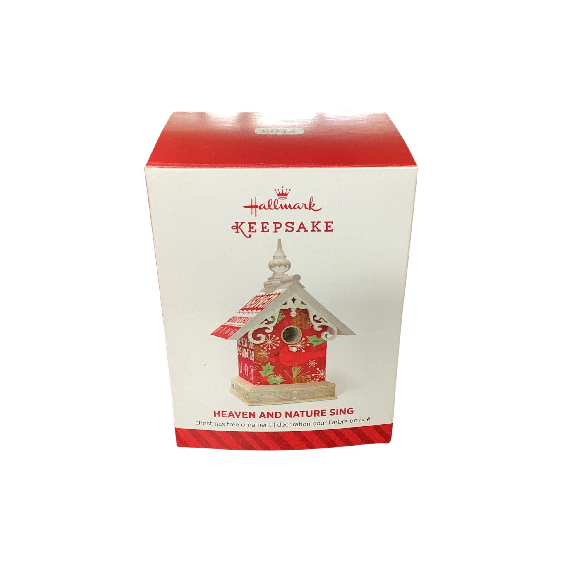 Celebrate the joy of the season with the 2014 Heaven and Nature Sing Hallmark Keepsake Ornament. This charming birdhouse features a vibrant cardinal perched on its front, adorned with holly accents and the festive phrase “Heaven and nature sing,” inspired by the Christmas carol "Joy to the World." Designed by artist Rodney Gentry, it measures approximately 2¼" × 3¼" × 2" and comes in its original box. A delightful addition for bird lovers and collectors alike.