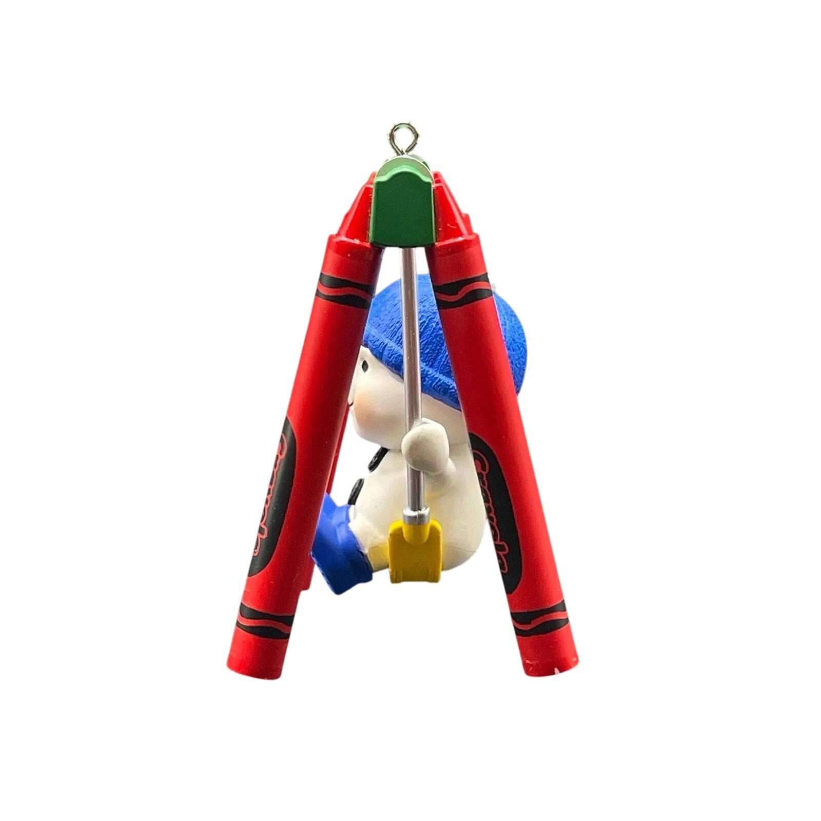 Add a whimsical twist to your holiday décor with the 2014 In the Swing of Things (Crayola Crayons) Keepsake ornament—an exclusive for Hallmark Gold Crown retailers. Designed by Orville Wilson, this tiny delight features a joyful snowman swinging back and forth on a playful swing set constructed from four vivid red Crayola crayons. Crafted in durable mixed materials, it measures approximately 1 ¾″ wide × 2 ¼″ tall × 1 ½″ deep, arrives boxed and hang-ready, and requires no batteries—just pure nostalgic charm.