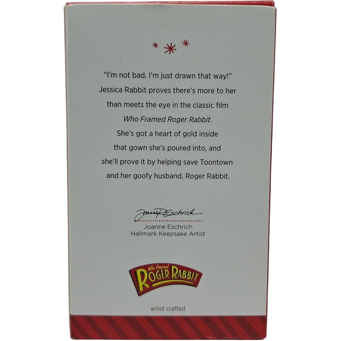 Step into the spotlight with this glamorous Hallmark ornament capturing Jessica Rabbit from Who Framed Roger Rabbit. Released as a Gold Crown Exclusive, this piece presents Jessica in her signature sultry red strapless dress, with glitter detailing and a dramatic slit—just as she appears in the film. The back features her name in elegant script and a star pattern. The ornament ships in its original packaging with hang tag.
