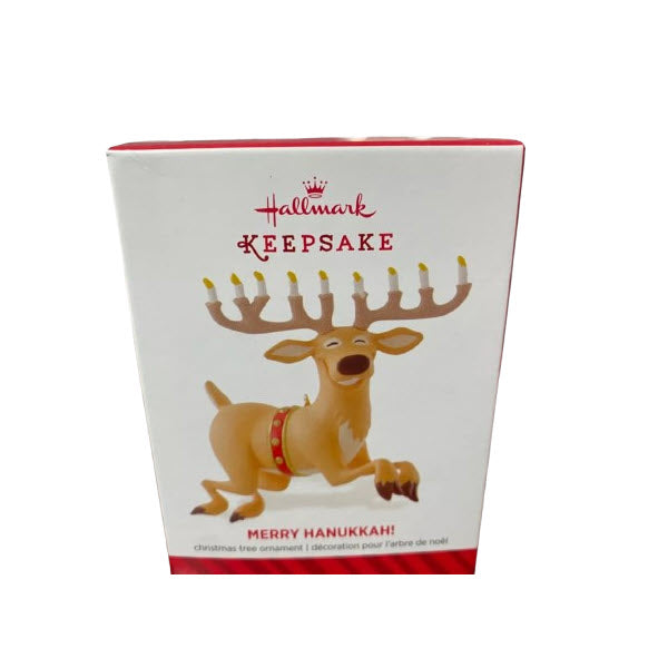 Bring a playful, holiday twist to Hanukkah décor with 2014 Merry Hanukkah!, featuring a whimsical reindeer whose antlers double as a menorah—nine glowing candles arranged in shining tribute to the Festival of Lights. This Hallmark Gold Crown Exclusive ornament by artist Robert Chad mixes traditional symbolism with holiday fun. The ornament comes boxed in its original packaging. No batteries, cords, lights (outside the candle effect), motion, or sound required—just a cheerful, expressive piece designed to hang proudly.