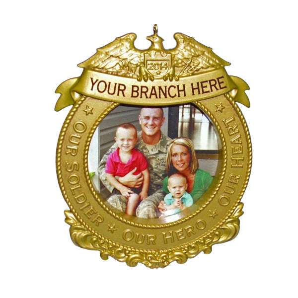 This ornament is designed as a tribute piece, shaped like a picture-frame style “Our Hero” holder that allows for personalization via included stickers depicting U.S. military service branches. The gold-toned metal or mixed-material holder bears the inscription “Our Soldier • Our Hero • Our Heart” and is meant to display a favourite photograph of someone serving (or having served) the country. The piece combines holiday décor with meaningful recognition, making it suitable both for tree display and keepsake purposes.