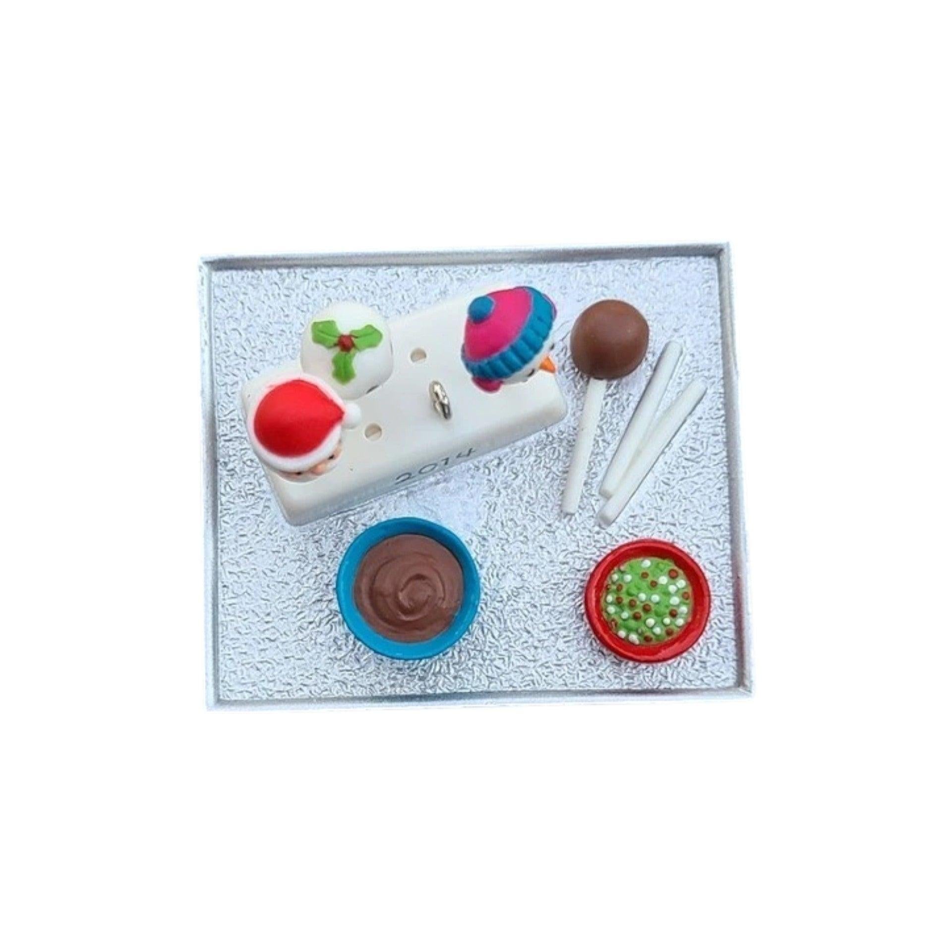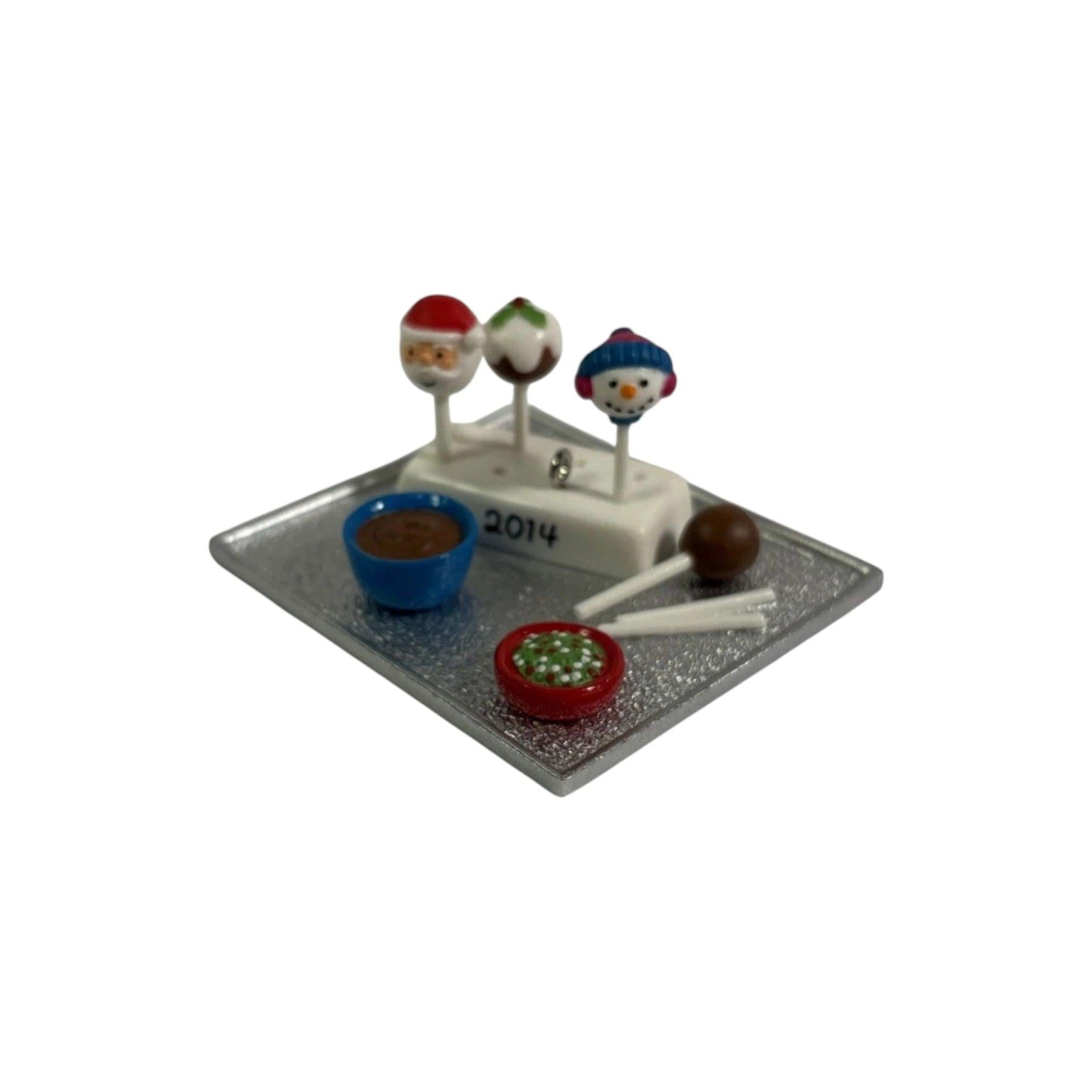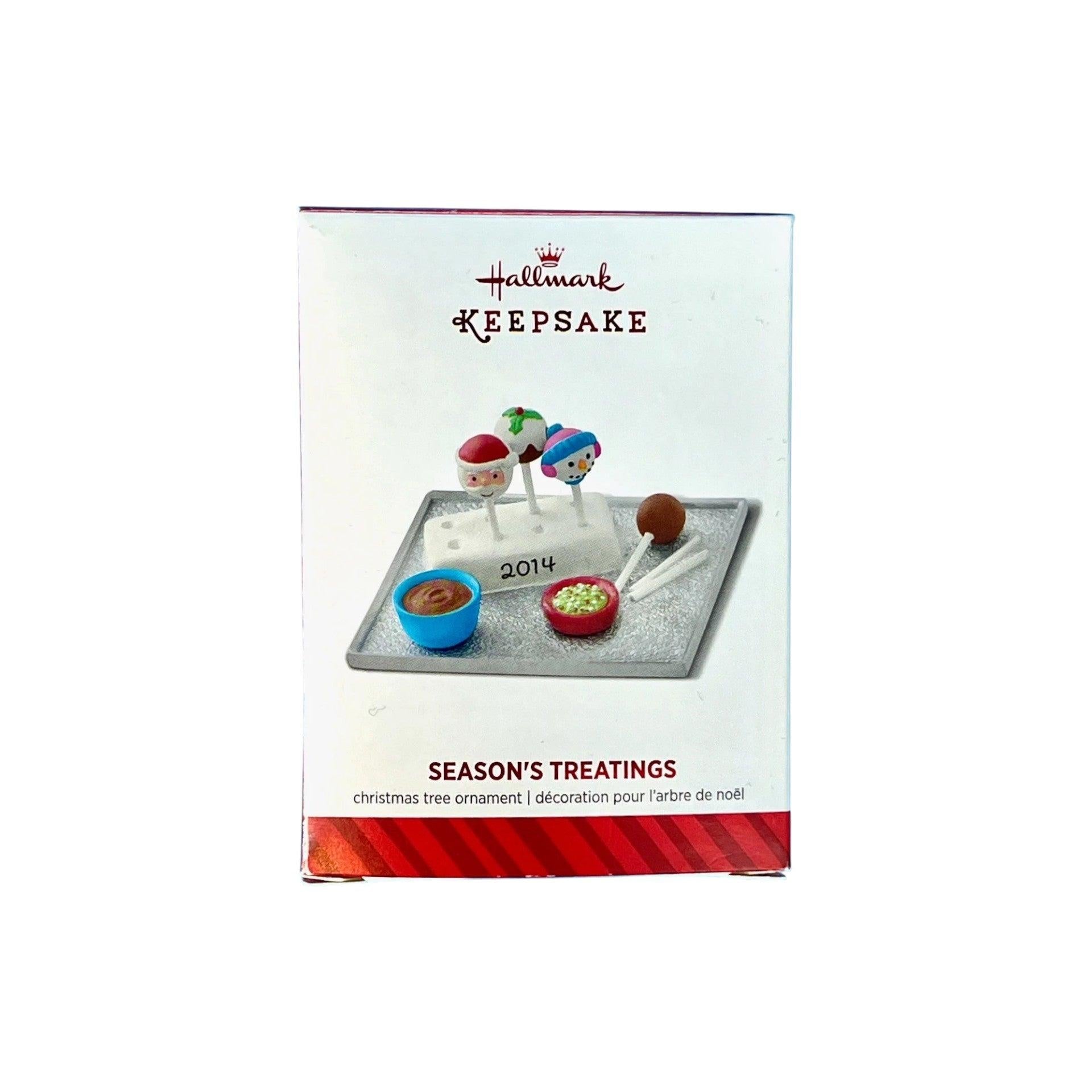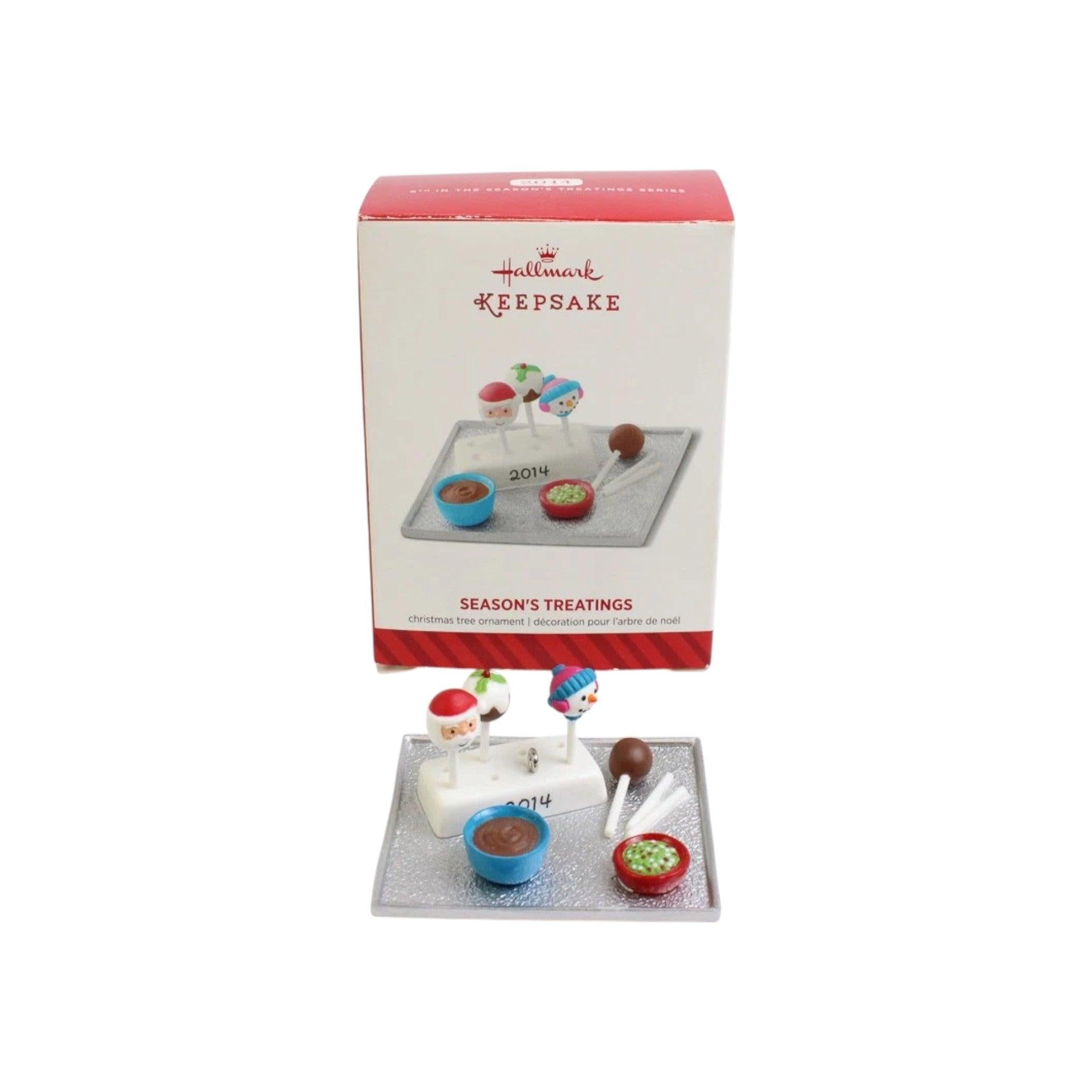 Bring tasty holiday cheer to your ornament collection with the 2014 Season’s Treatings Keepsake Ornament titled "Season’s Treatings." This Gold Crown exclusive features a festive tray of decorated cake pops—one shaped like a snowman, the other a jolly Santa—perfectly captured in resin. The package includes the ornament, original box, and decorative hang tag. No batteries or cords needed; simply hang it on your tree for a sweet seasonal accent.