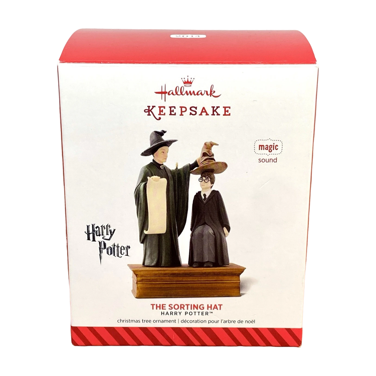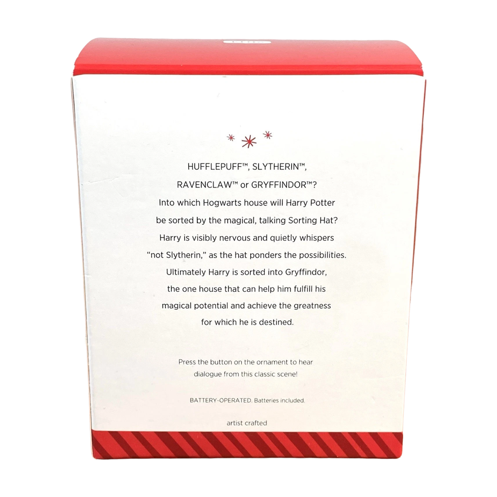 This enchanting 2014 Hallmark ornament captures the iconic Hogwarts moment when Harry Potter anxiously awaits his fate under the legendary Sorting Hat. Featuring a talking Sorting Hat perched above Harry, this sound-and-motion collectible plays dialogue from the classic scene when a button is pressed. Crafted from mixed materials and hand-painted, it arrives in its original Keepsake box labeled “Magic Sound and Motion,” complete with tag and memory card. Requires 2 LR44 batteries (included) and is ready to hang with no additional power or set-up.