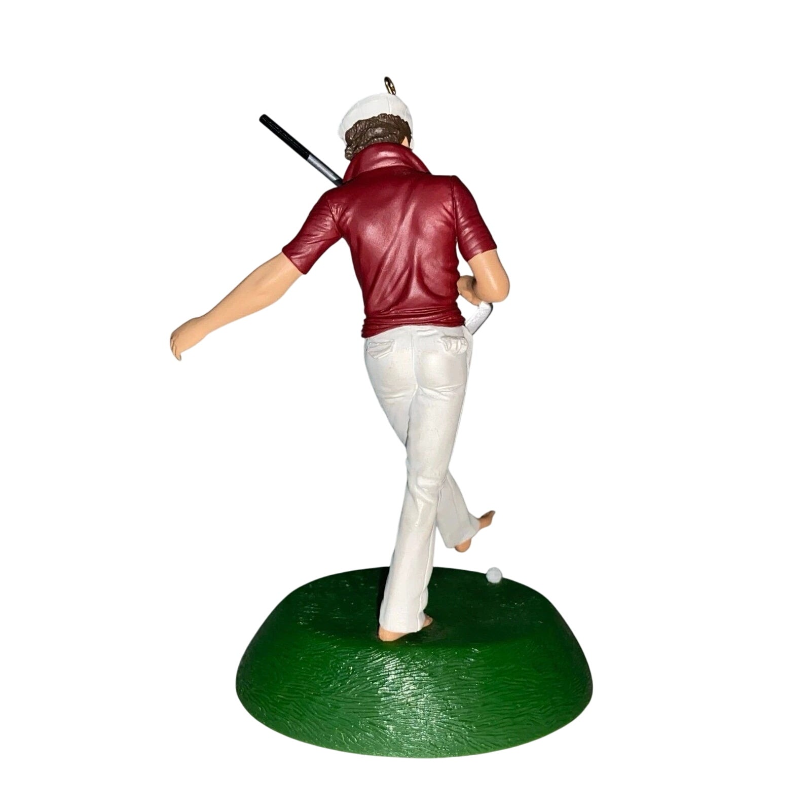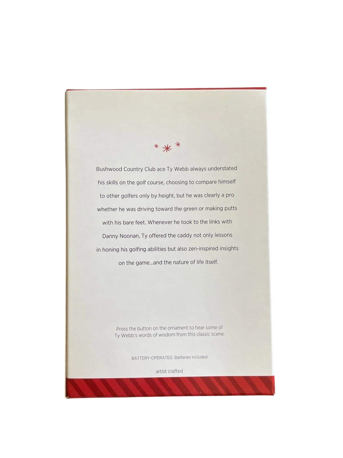 Step into the whimsical world of Caddyshack with this 2014 release, The Zen of Golf. This ornament captures Ty Webb in one of his iconic barefoot moments, striding across the green with a relaxed confidence and famously dispensing his offbeat golf wisdom. Press the hidden button, and you’ll hear famous lines from that classic scene — true to Hallmark’s Magic Sound tradition.