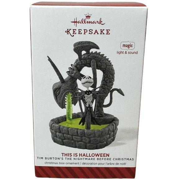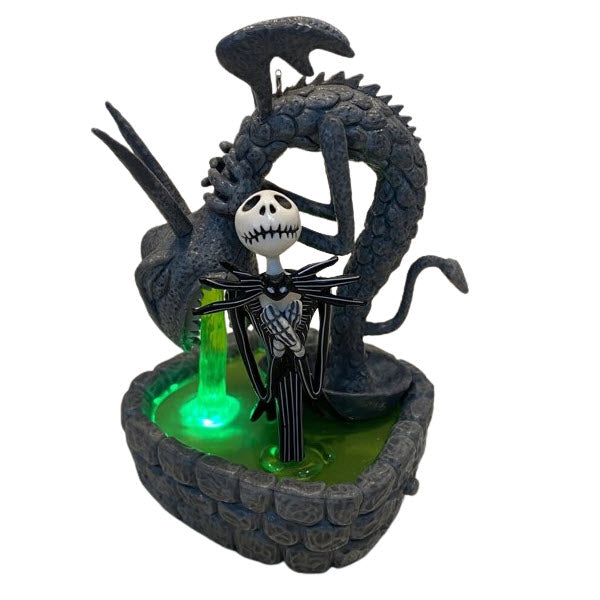 Celebrate the spooky season with this enchanting 2014 ornament, featuring Jack Skellington standing in the eerie Halloween Town fountain, surrounded by eerie statues and flickering green light. This Magic Light & Sound collectible includes the original gift box and ornament tag, and requires no cords—just press the base to watch the fountain glow and hear a haunting melody from the movie. Batteries included.