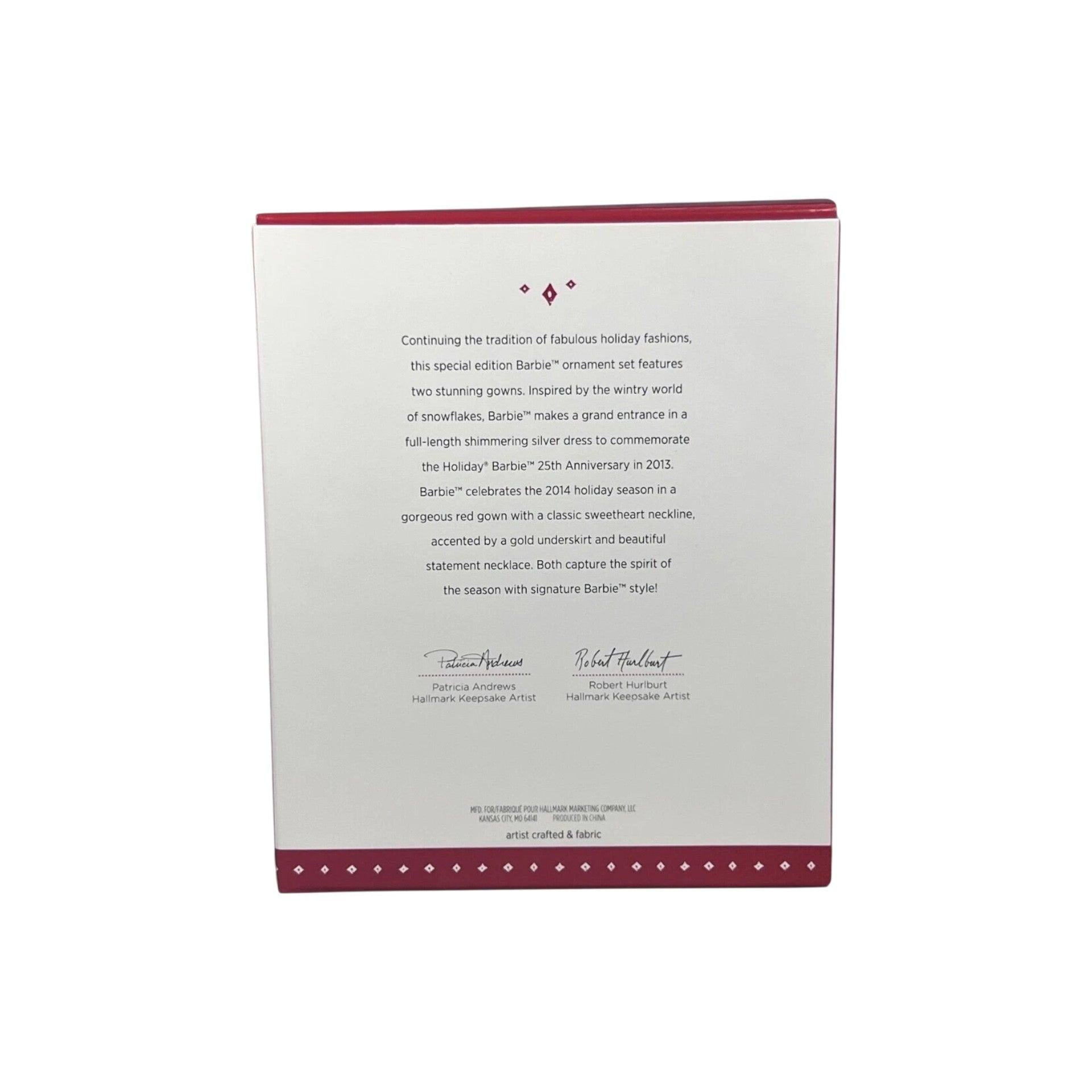 Celebrate Barbie's festive fashion legacy with the 2015 Celebration Barbie Ornament Set, a chic “bonus pack” featuring two Keepsake ornaments inspired by the Holiday Barbie dolls from 2013 and 2014. Designed as a Hallmark Gold Crown Exclusive and first available at the 2015 Premiere Event, this set provides collectors with a beautifully curated way to complete their holiday Barbie collection. Each ornament depicts Barbie in a glamorous gown—one in festive red and gold, the other in radiant silver—crafted with fabric-like details and designed for elegant display. The set includes the original Keepsake box and tag. No power, lights, or batteries required—this is purely decorative charm.