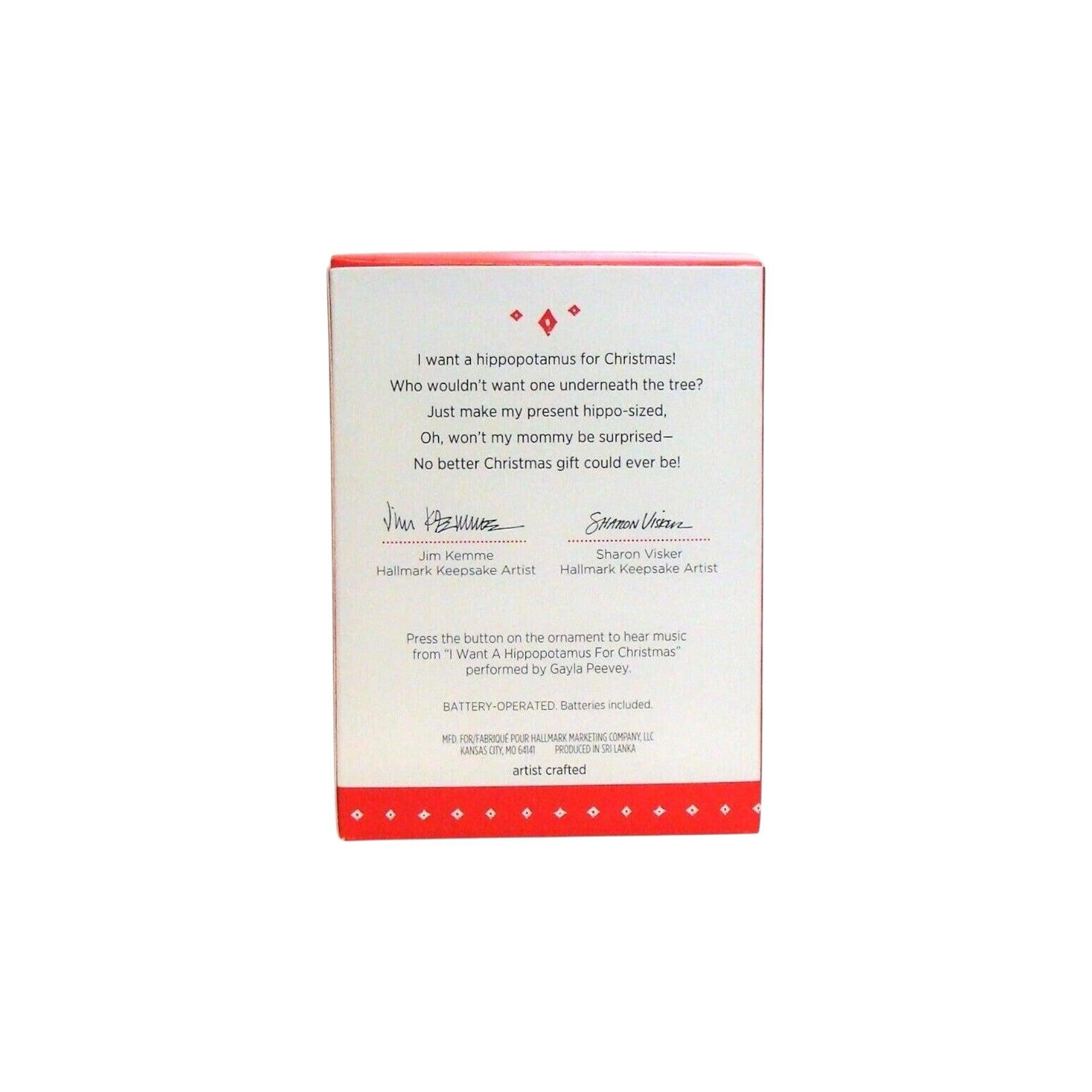 This playful 2015 Hallmark ornament brings to life the beloved novelty holiday song “I Want a Hippopotamus for Christmas.” Featuring a cheerful hippopotamus dressed for the holidays, complete with festive colors and whimsical detailing, this ornament adds humor and nostalgia to any Christmas tree. Perfect for fans of classic Christmas songs and fun animal-themed décor, the ornament includes the hippopotamus figure and typically the original Hallmark Keepsake box when available. Fully decorative—no lights, cords, or batteries required.