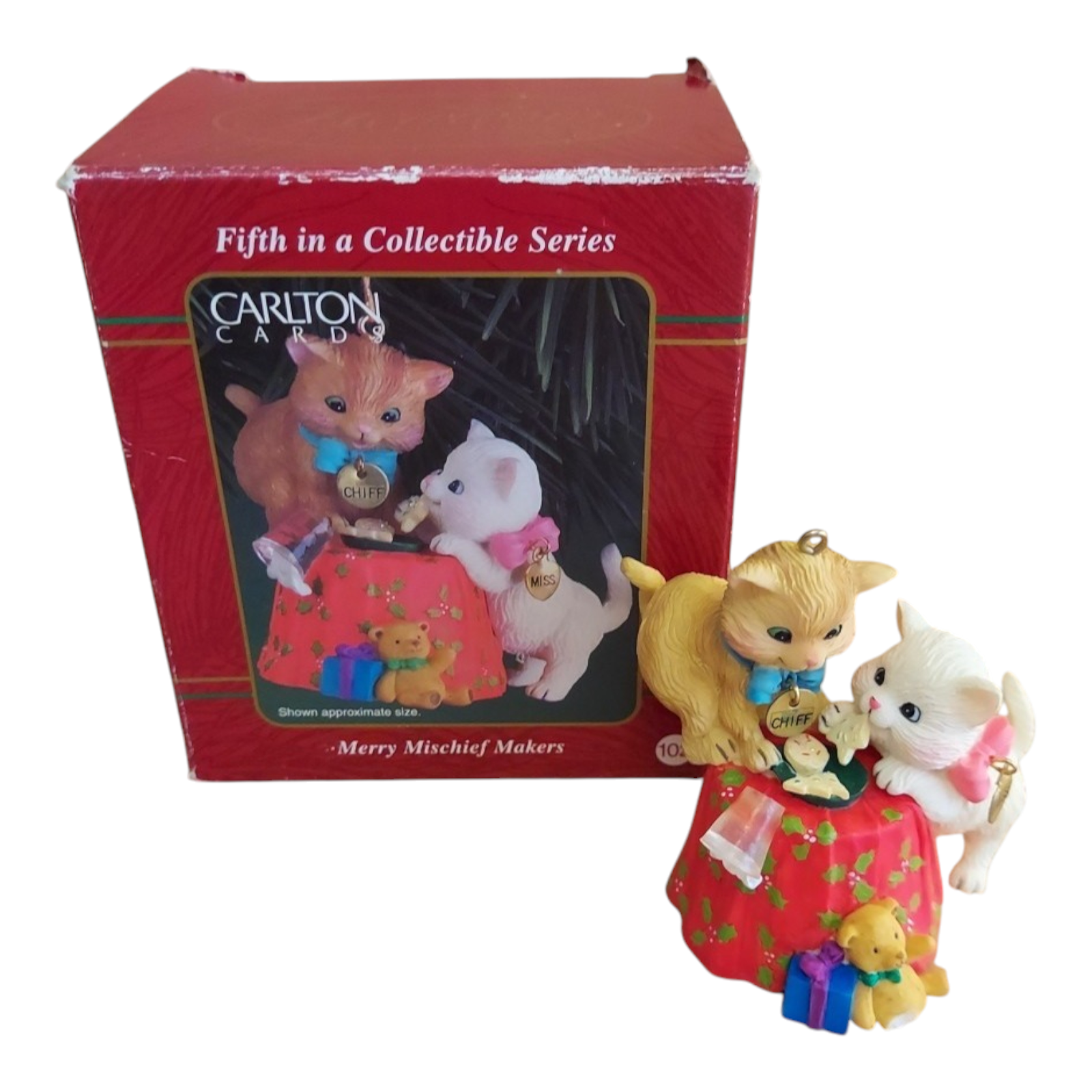 This charming collectible ornament from the Merry Mischief Makers series features an adorable kitten in playfully mischievous holiday styling—perfectly capturing the whimsical spirit of the line. The detailed sculpt shows the kitten in mid-pounce or batting at a festive ribbon or ornament ball, finished in bright holiday colours, with hand-painted detail and a gloss or glitter accent. A fine example of the Heirloom collection’s combination of fun, craftsmanship and seasonal cheer, this piece makes a delightful addition to any cat-lover’s tree or a vintage ornament collection.