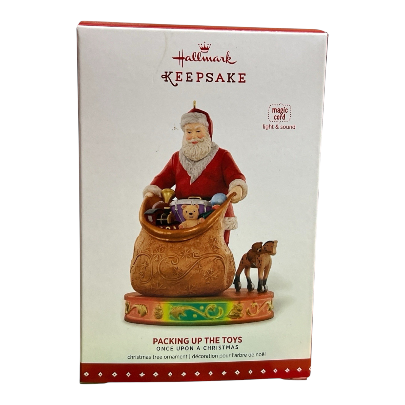 This 2015 release from the beloved Once Upon a Christmas series features Hallmark’s Santa checking off his overflowing toy sack—complete with intricate detailing such as a toy pony beside him—to commemorate the magical moment before Christmas Eve departures. As the 5th installment in the Santa’s Story series, this piece offers a dynamic story-moment in ornament form and includes the brand’s “Magic” functionality for lights and sound when connected to the Magic Cord. The combination of rich colours, sculpted scene, and multimedia feature make it a prime collectible for Santa aficionados and Hallmark collectors alike.