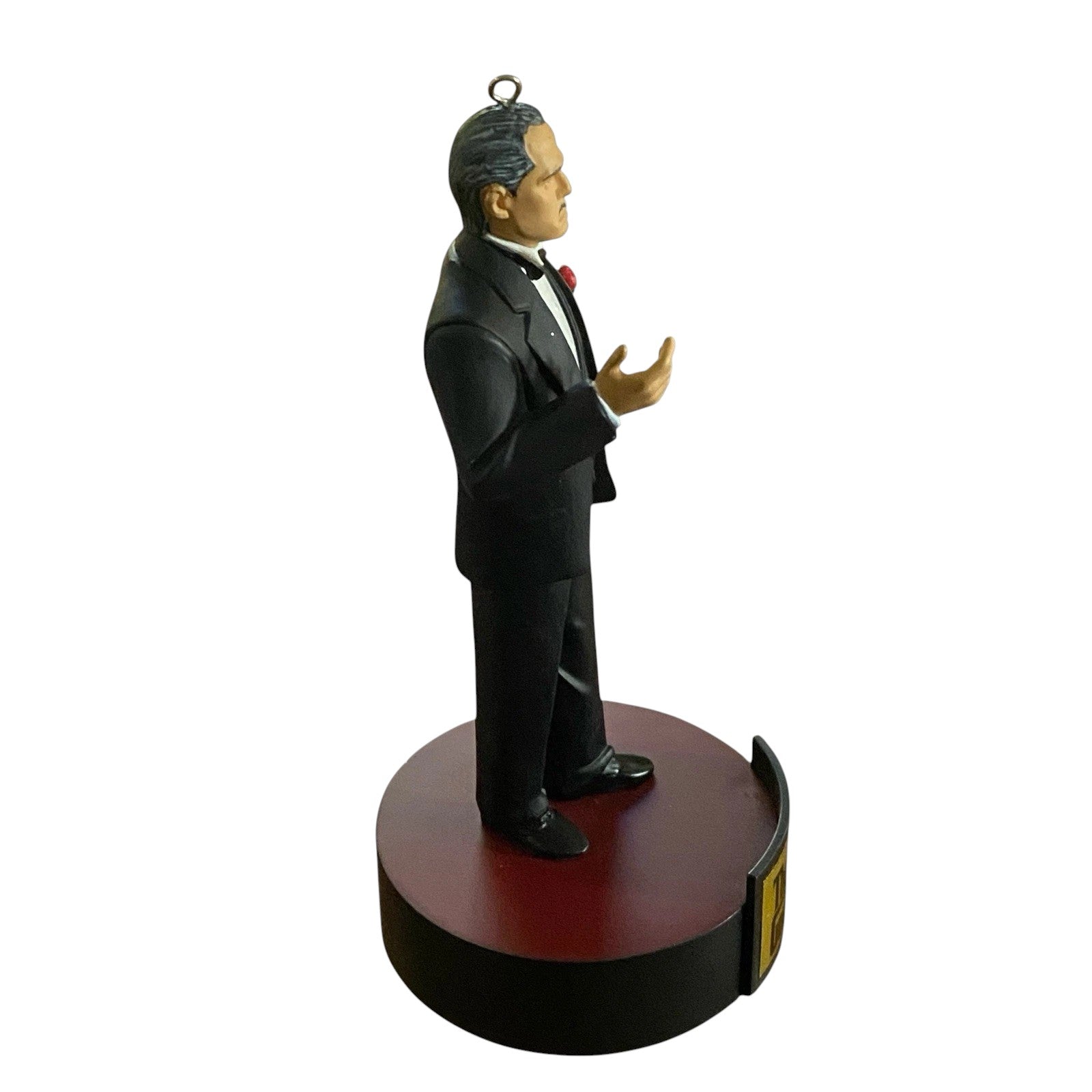 Step into the world of organized crime with the 2015 "The Godfather" Hallmark Keepsake Ornament. This detailed piece features Don Vito Corleone in his iconic tuxedo, complete with a red rose boutonnière and cigar. Press the button to hear memorable quotes from the legendary film, bringing the character to life. Crafted from durable materials, this ornament is a must-have for movie enthusiasts and collectors alike. It comes in its original packaging, ensuring its pristine condition for display or gifting.