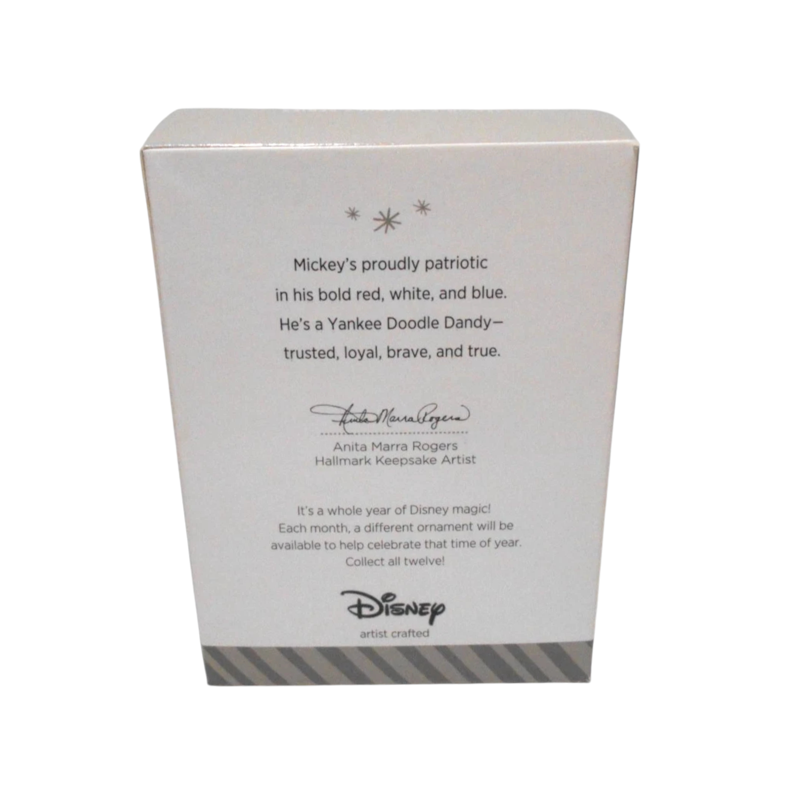 Celebrate Independence Day Disney-style with 2015 Yankee Doodle Mickey, the twelfth and final ornament in Hallmark’s A Year of Disney Magic series. Mickey Mouse dons a red, white, and blue striped top hat, standing proudly on a blue base with a patriotic stance—perfect for the Fourth of July. This Gold Crown Exclusive collectible arrives in its original box with hanging loop, tag, and protective insert. No batteries, cords, or lights are required—its charm lies in the static, colorful design.