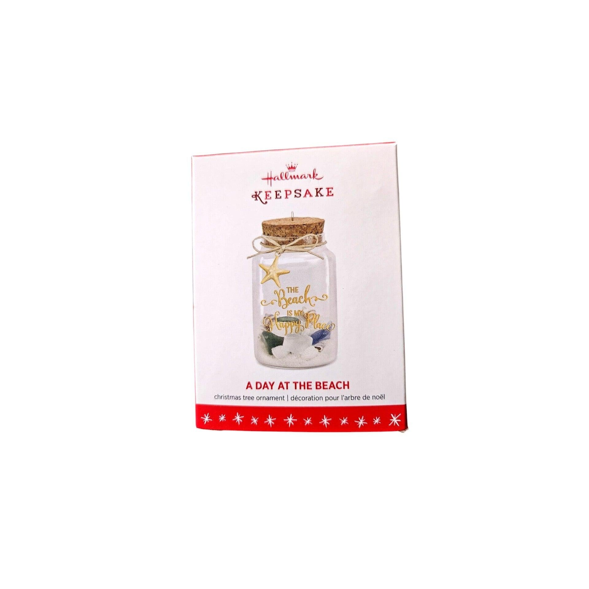 Capture sunny seaside nostalgia with this 2016 A Day at the Beach ornament from Hallmark’s Beach theme. This handcrafted glass ornament features a charming corked jar filled with real beach sand, seashells, and sea glass, and is inscribed with the cheerful phrase “The Beach is My Happy Place”—perfect for beach lovers and coastal décor enthusiasts. The ornament arrives safely packed in its original Hallmark box, ready to hang on your tree or display year-round. This piece is decorative only; no batteries or cords are needed.