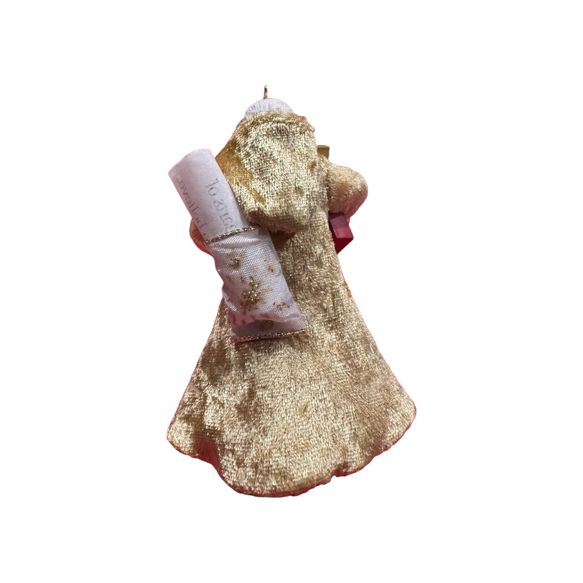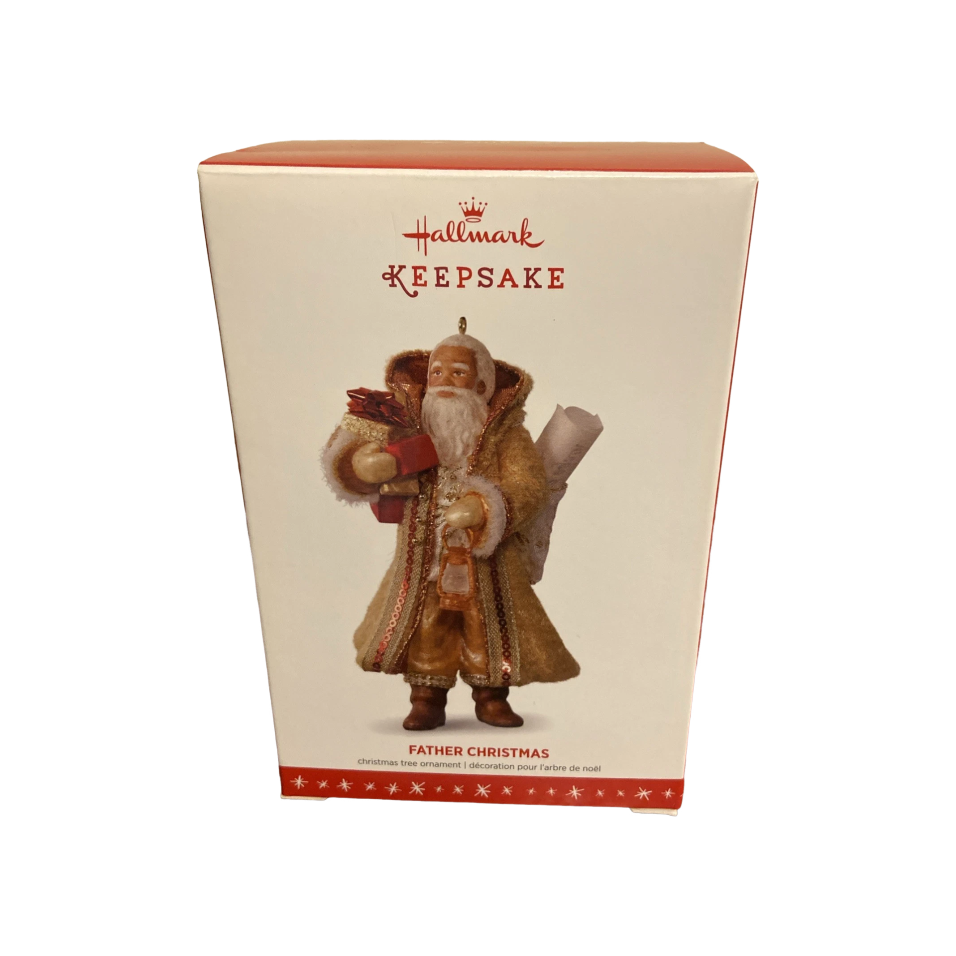 Celebrate the timeless tradition of Christmas with the 2016 Father Christmas ornament from Hallmark's Father Christmas series. Designed by artist Joanne Eschrich, this handcrafted fabric ornament features Father Christmas in a rich gold and amber coat, holding a lantern and a gift. A scroll attached to his pack reads: "The light of Christmas shines brightest in the hearts of those who believe." This elegant piece is perfect for collectors and those who cherish the spirit of the season. It comes in its original packaging, ensuring its pristine condition for display or gifting.