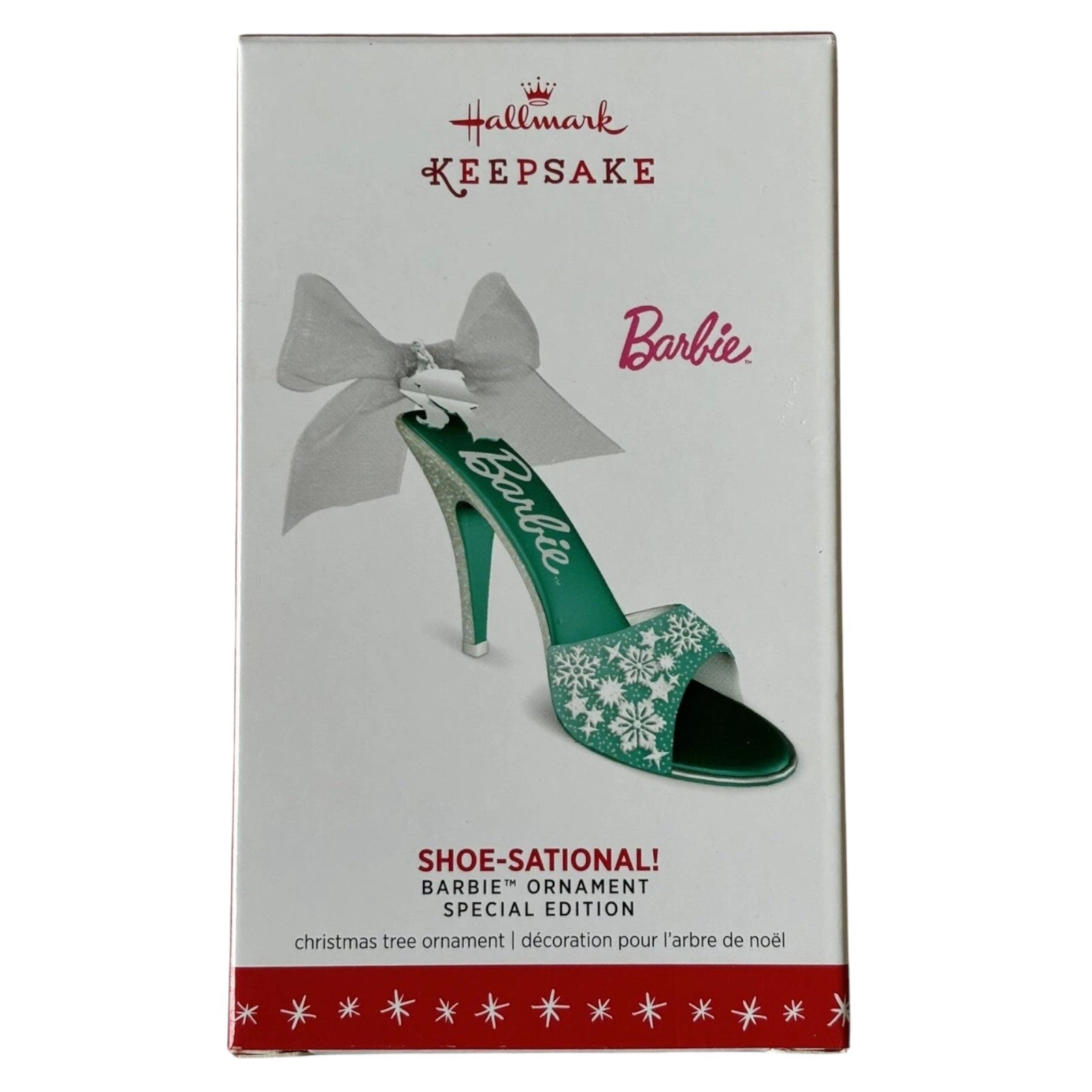 Step into a world of elegance with the 2016 Shoe-Sational! ornament, a dazzling high-heeled shoe designed exclusively for Barbie fans. Crafted in a vibrant green hue, this open-toe pump is adorned with intricate snowflake patterns and topped with a sheer white bow, capturing the essence of winter glamour. Designed by Debra Nielsen, this ornament was first available at Hallmark's December 2016 Gift of Memories event. It comes in its original packaging, ensuring its pristine condition for display or gifting.