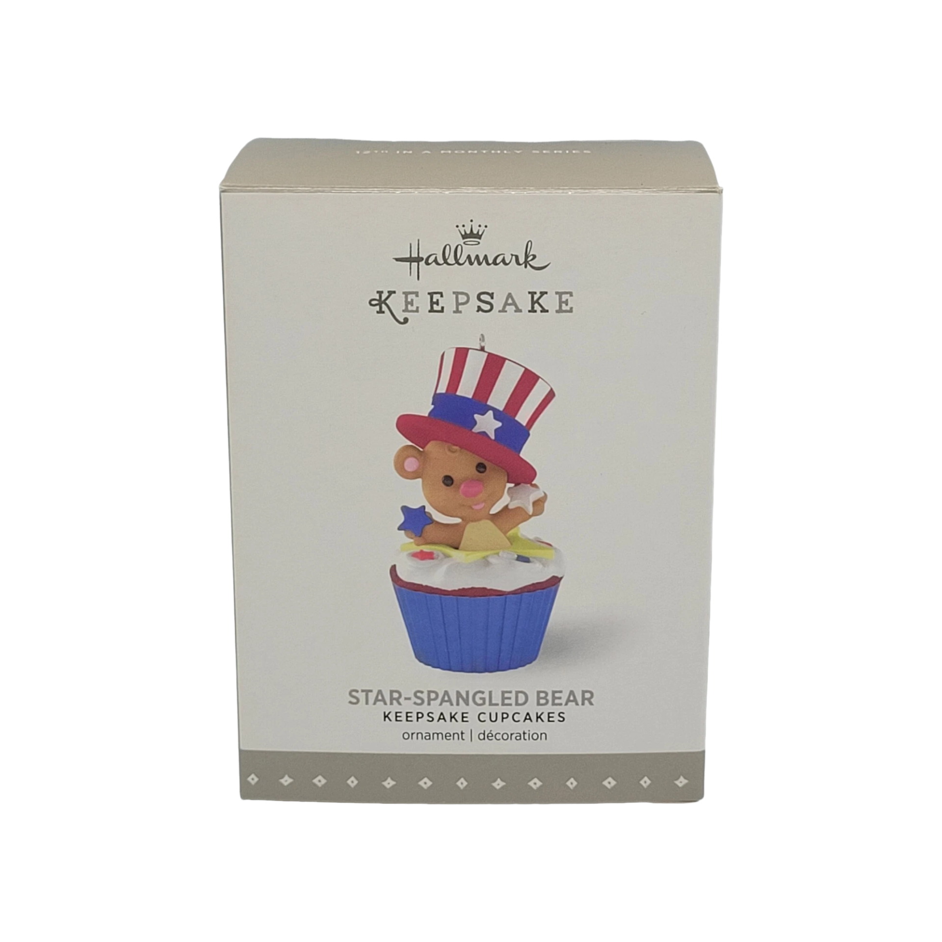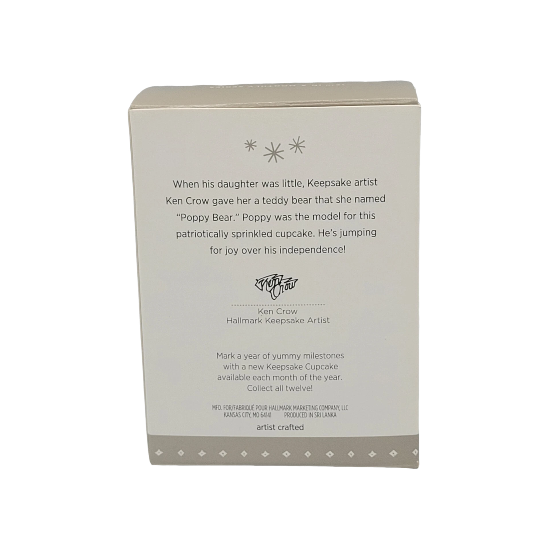 The 2016 Star‑Spangled Bear is the 12th ornament in Hallmark’s Keepsake Cupcakes series, featuring an adorable bear wearing a stars‑and‑stripes top hat, perched atop a patriotic cupcake with red, white, and blue star sprinkles. Designed by Ken Crow, this hand‑painted resin miniature arrives mint in box, with its original packaging and tag. No batteries, cords, or light strings are needed—simply hang and celebrate the freedom-filled spirit!