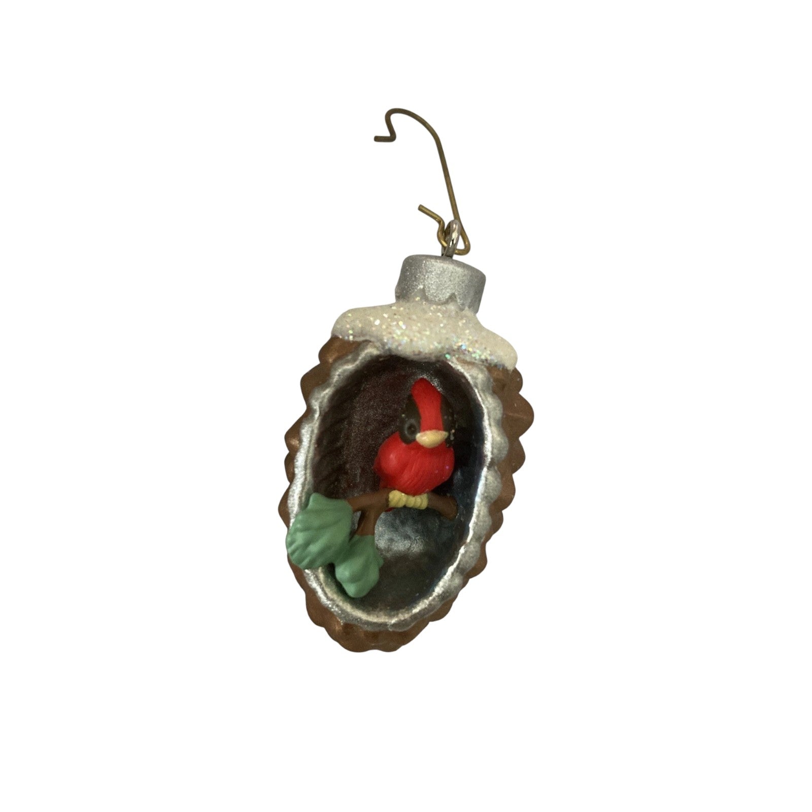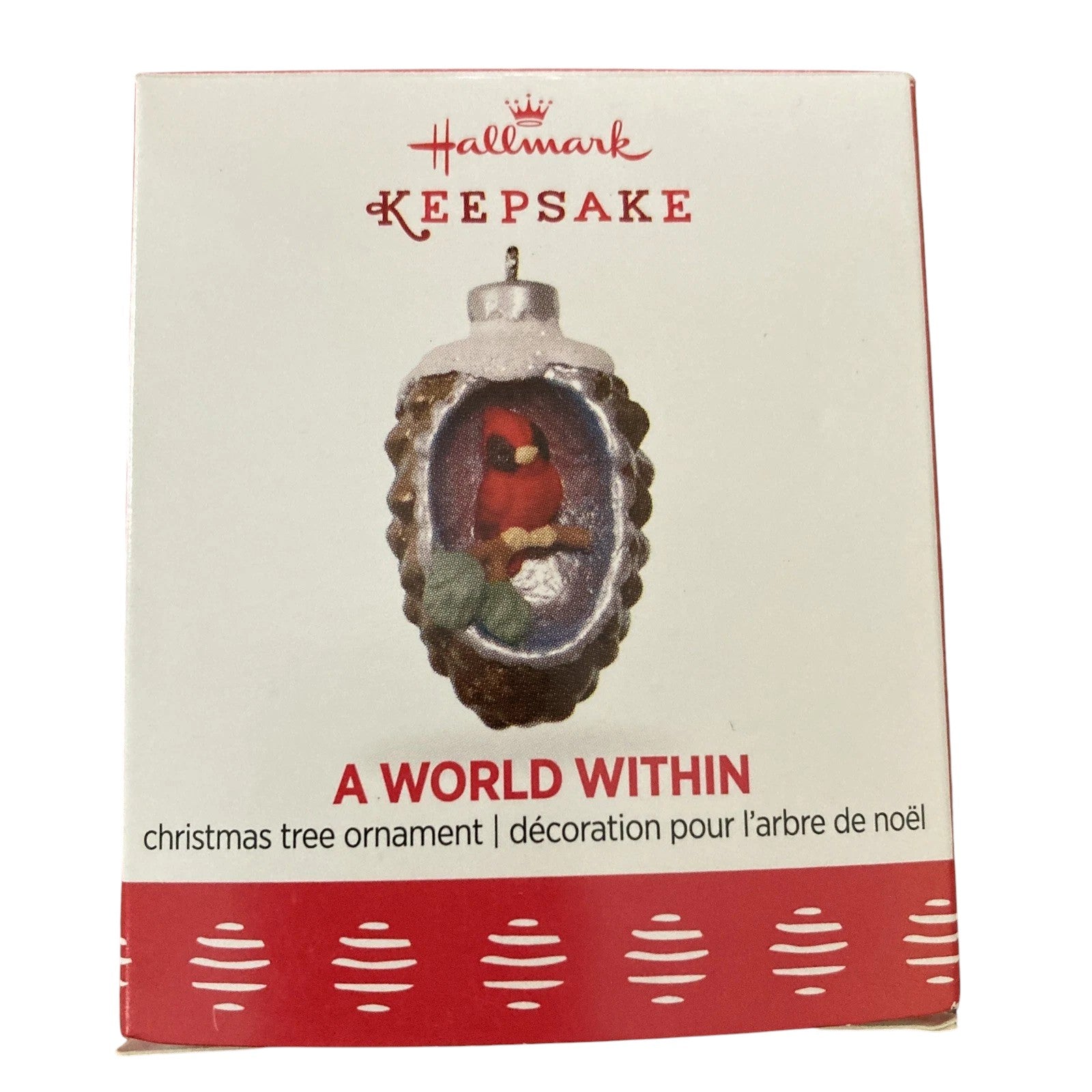 Delight in a world of tiny wonders with Hallmark’s A World Within – Cardinal in Pinecone miniature ornament from 2017. Crafted from resin and nestled inside a snow-dusted pinecone, a bright red cardinal brings a festive pop of color to your holiday décor. Designed by Tammy Haddix, this enchanting ornament comes boxed and ready to display—no batteries or accessories required. Its compact charm makes it ideal for trees, wreaths, or as part of a miniature collection.