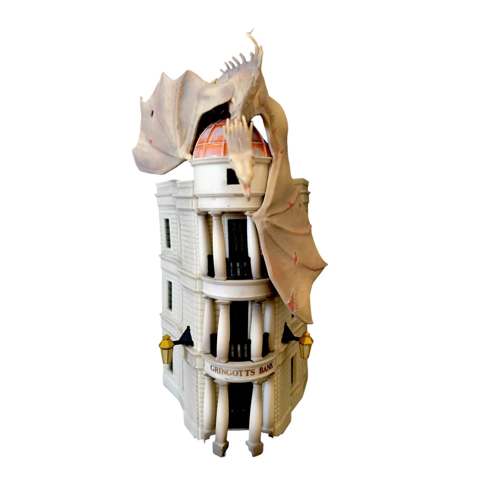 This deluxe 2017 Hallmark ornament elegantly recreates Gringotts Wizarding Bank — complete with a majestic dragon perched atop the vault-run building. Designed by Orville Wilson, the hand‑painted plastic model includes a "magic window" effect: insert a miniature push‑in type bulb through the base to illuminate the bank's interior windows. Packaged in its original Keepsake box with tag and memory card, this collectible requires no built‑in batteries, only a light string for optional display lighting.