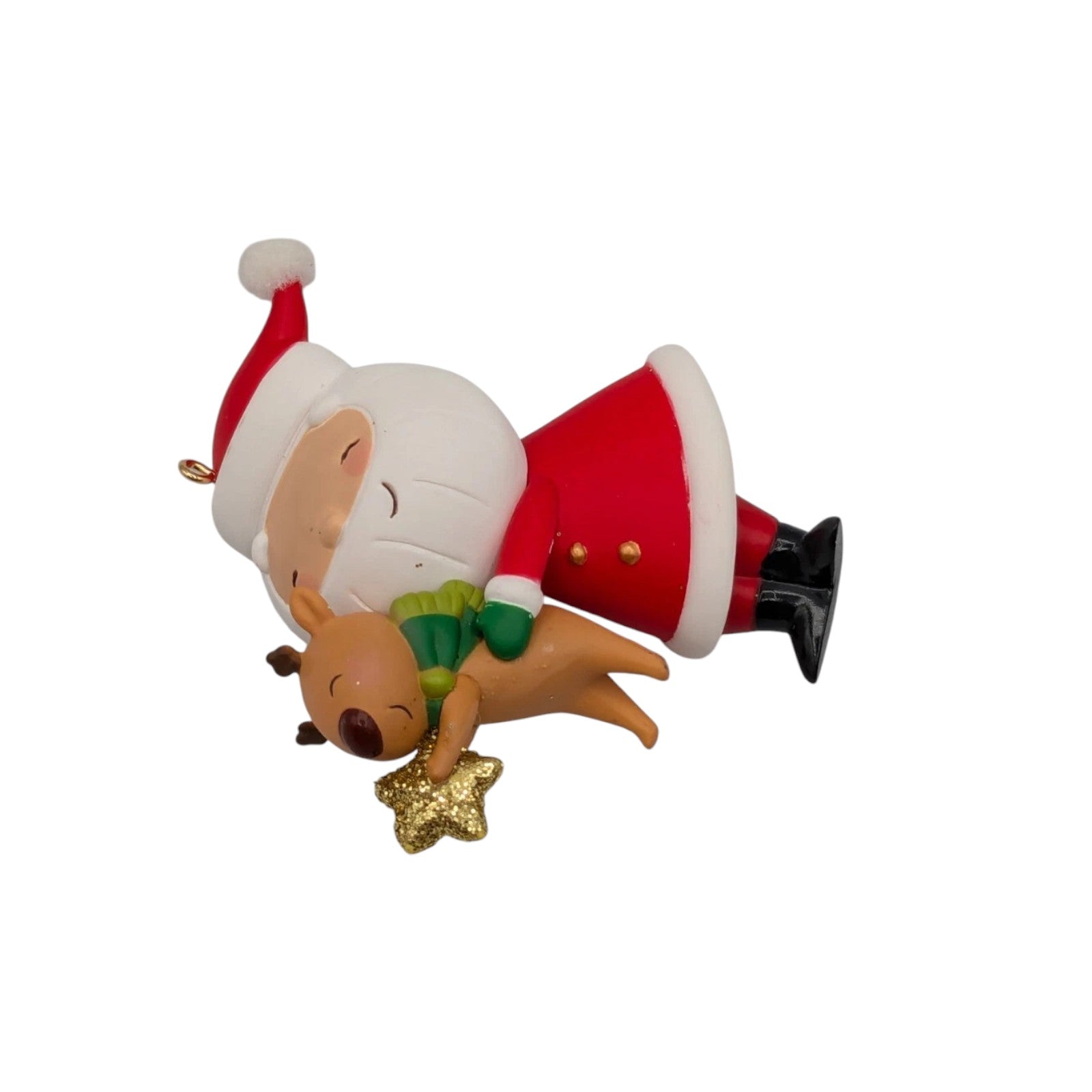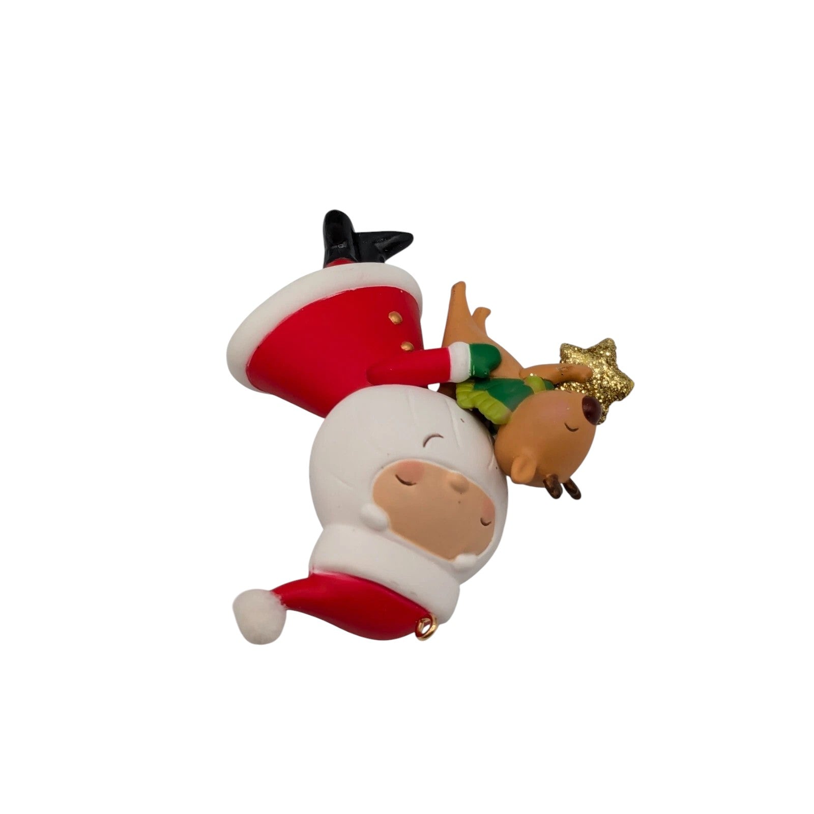 Celebrate the magic of the season with the 2017 Kringle and Kris ornament from Hallmark's cherished series. This heartwarming piece depicts Santa Claus joyfully lifting his reindeer companion, Kris, to place a glittering gold star atop the Christmas tree. Designed by artist Kristina Gaughran, the ornament captures the playful and festive spirit of the duo's holiday adventures. Crafted from durable materials, it comes in its original packaging, ensuring its pristine condition for collectors. No batteries or cords are required—simply hang and enjoy the festive charm it brings to your holiday decor.