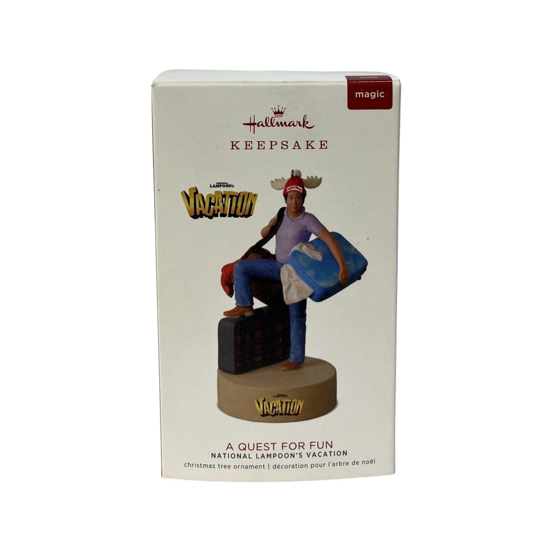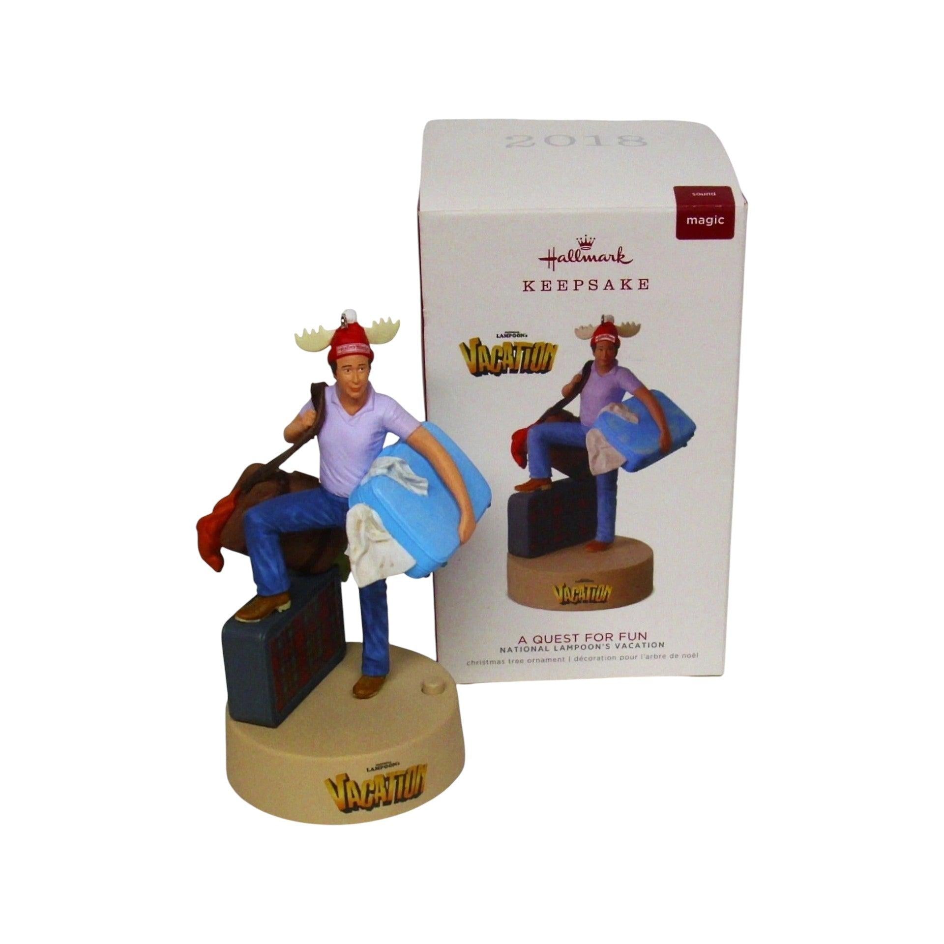 The 2018 A Quest for Fun Hallmark ornament captures the unforgettable moment from National Lampoon’s Christmas Vacation when the Griswold family heads out in their iconic station wagon—complete with the oversized Christmas tree strapped to the roof. Packed with humorous detail, from the vintage wood-paneled car to the enormous tree, this ornament celebrates the chaotic charm of the classic holiday film. It typically comes with its original Hallmark Keepsake box and does not require batteries, cords, or accessories.